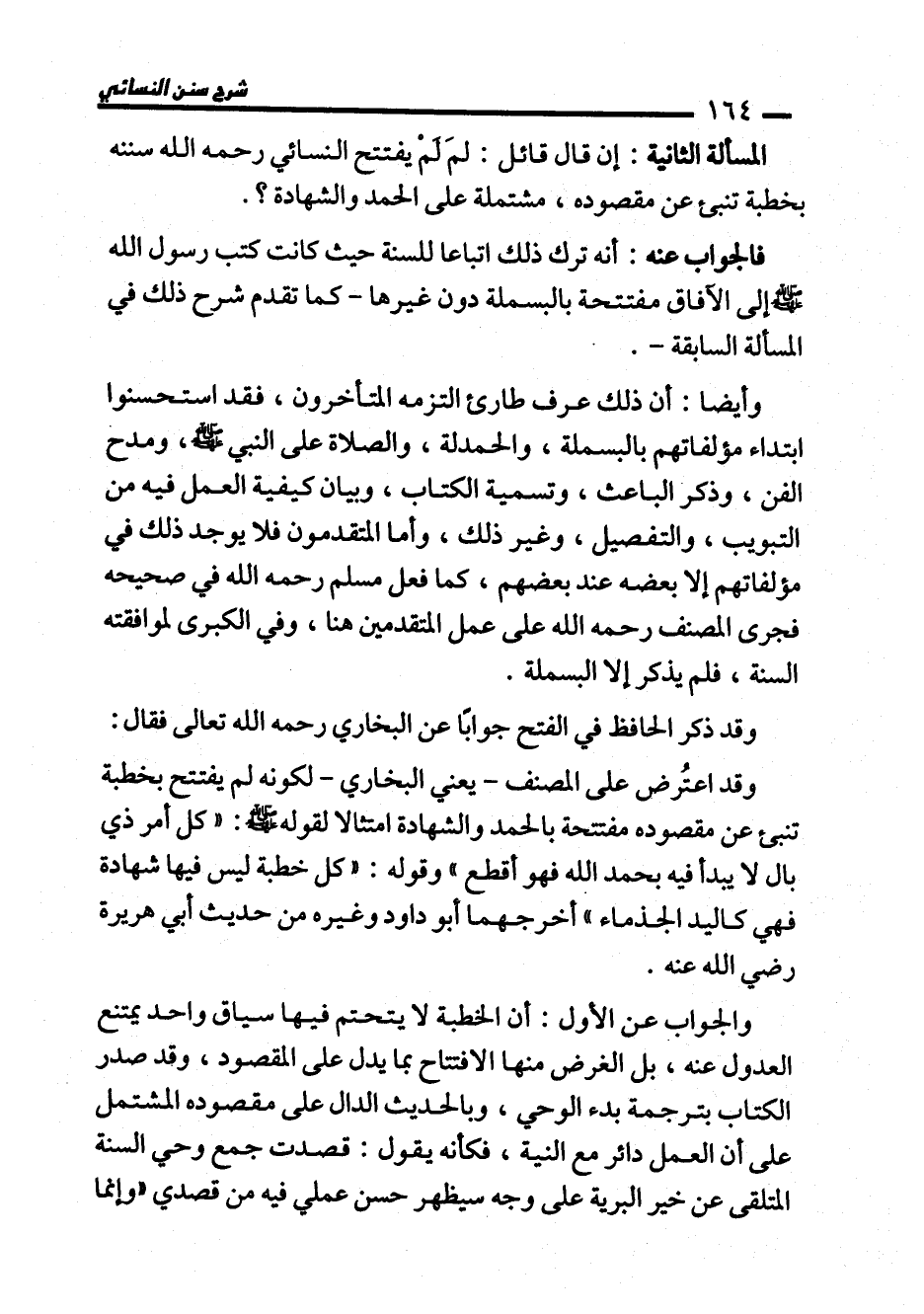 المسألة الثانية: إن قال قائل: لمَ لَمْ يفتتح النسائي رحمه الله سننه بخطبة تنبئ عن مقصوده، مشتملة على الحمد والشهادة؟.