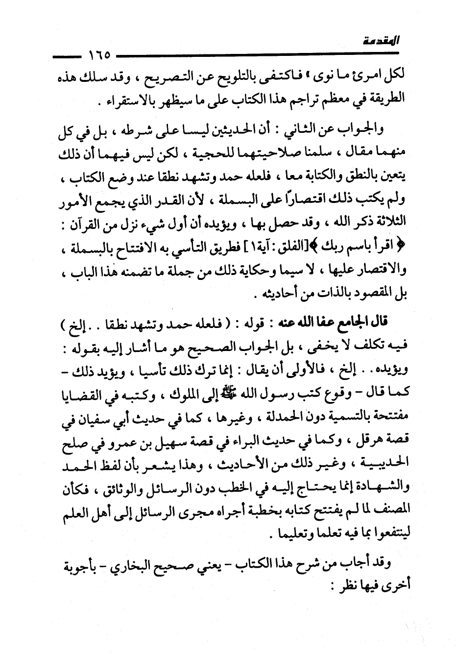 والجواب عن الثاني: أن الحديثين ليسا على شرطه، بل في كل منهما مقال، سلمنا صلاحيتهما للحجية، لكن ليس فيهما أن ذلك يتعين بالنطق والكتابة معا، فلعله حمد وتشهد نطقا عند وضع الكتاب، ولم يكتب ذلك اقتصارًا على البسملة؛ لأن القدر الذي يجمع الأمور الثلاثة ذكر الله، وقد حصل بها، ويؤيده أن أول شيء نزل من القرآن: {اقْرَأْ بِاسْمِ رَبِّكَ} [الفلق: آية 1]، فطريق التأسي به الافتتاح بالبسملة، والاقتصار عليها، لا سيما وحكاية ذلك من جملة ما تضمنه هذا الباب، بل المقصود بالذات من أحاديثه.