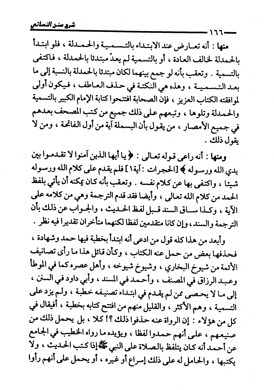 ومنها: أنه راعى قوله تعالى: {يَا أَيُّهَا الَّذِينَ آمَنُوا لَا تُقَدِّمُوا بَيْنَ يَدَيِ اللَّهِ وَرَسُولِهِ} [الحجرات: آية1] فلم يقدم على كلام الله ورسوله شيئا، واكتفى بها عن كلام نفسه. وتعقب بأنه كان يمكنه أن يأتي بلفظ الحمد من كلام الله تعالى، وأيضا فقد قدم الترجمة وهي من كلامه على الآية، وكذا ساق السند قبل لفظ الحديث، والجواب عن ذلك بأن الترجمة والسند، وإن كانا متقدمين لفظا لكنهما متأخران تقديرا فيه نظر.