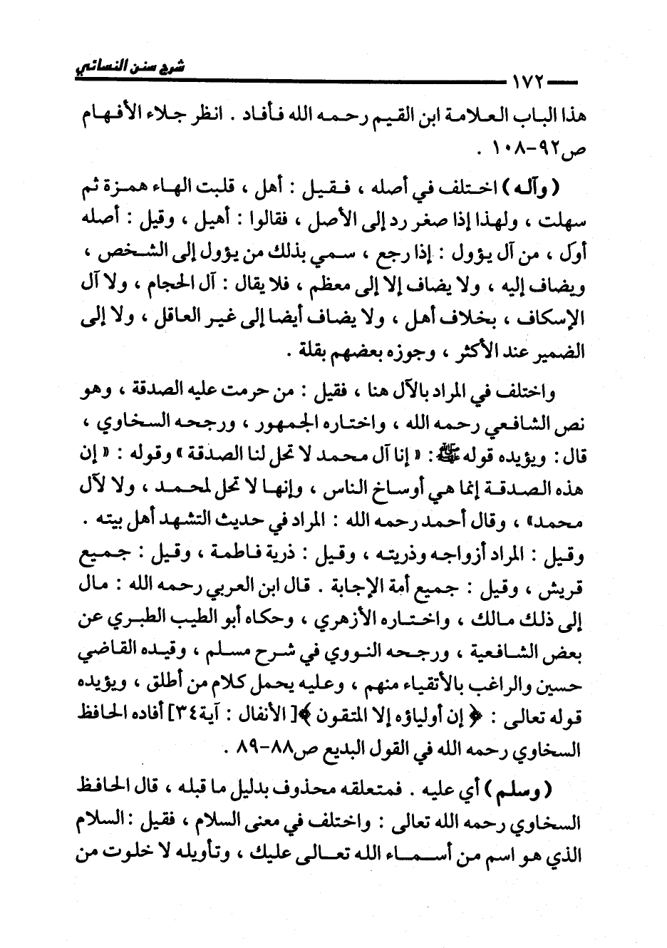 واختلف في المراد بالآل هنا، فقيل: من حرمت عليه الصدقة، وهو نص الشافعي رحمه الله، واختاره الجمهور، ورجحه السخاوي، قال: ويؤيده قوله - صلى الله عليه وسلم -: "إنا آل محمَّد لا تحل لنا الصدقة" وقوله: "إن هذه الصدقة إنما هي أوساخ الناس، وإنها لا تحل لمحمد، ولا لآل محمَّد"، وقال أحمد رحمه الله: المراد في حديث التشهد أهل بيته.