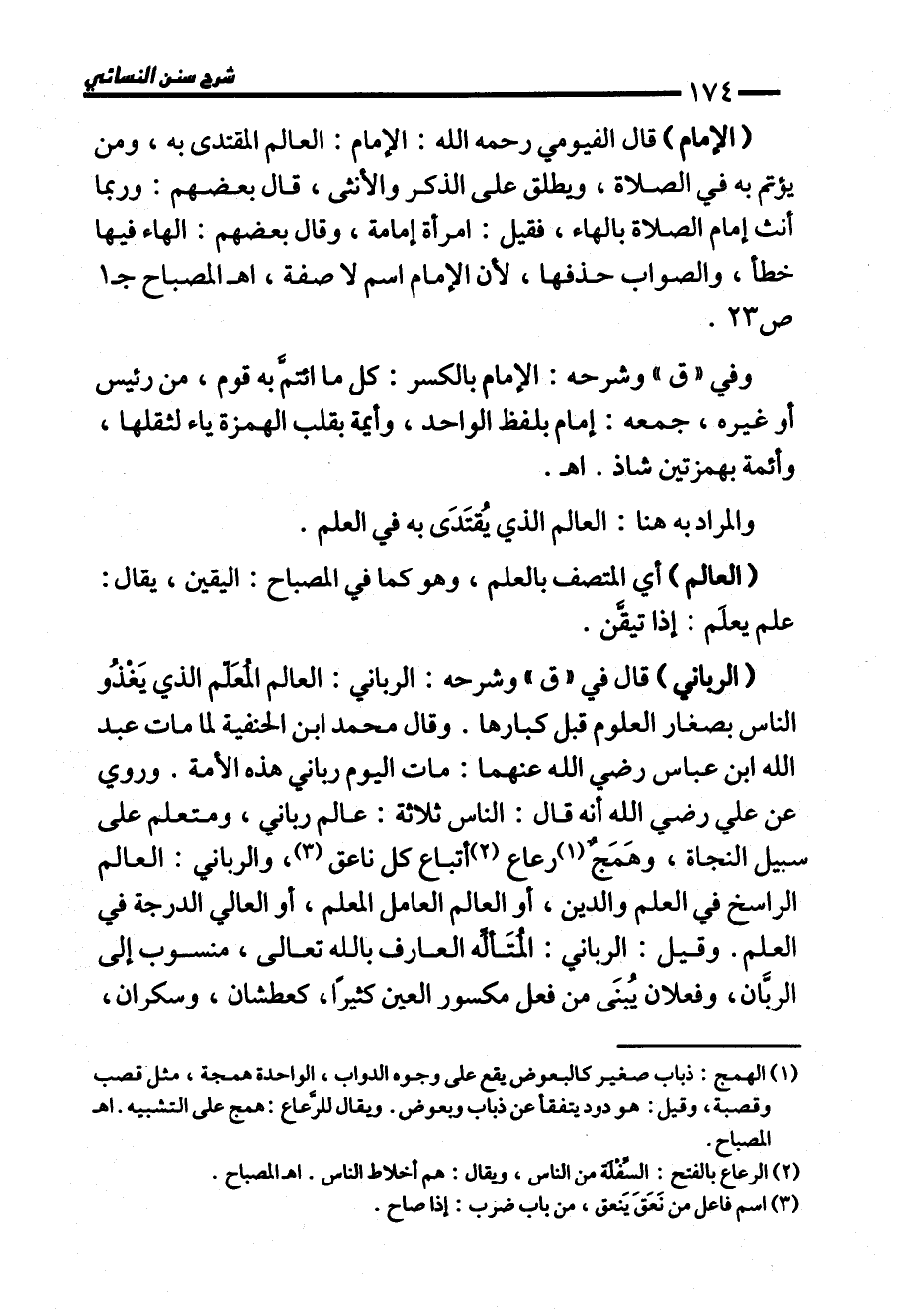 (الرباني) قال في "ق" وشرحه: الرباني: العالم المُعَلّم الذي يَغذُو الناس بصغار العلوم قبل كبارها. وقال محمَّد ابن الحنفية لما مات عبد الله ابن عباس رضي الله عنهما: مات اليوم رباني هذه الأمة. وروي عن علي رضي الله أنه قال: الناس ثلاثة: عالم رباني، ومتعلم على سبيل النجاة، وهَمَجٌ (¬1) رعاع (¬2) أتباع كل ناعق (¬3)، والرباني: العالم الراسخ في العلم والدين، أو العالم العامل المعلم، أو العالي الدرجة في العلم. وقيل: الرباني: المُتَألِّه العارف بالله تعالى، منسوب إلى الربَّان، وفعلان يُبنَى من فعل مكسور العين كثيرًا، كعطشان، وسكران،