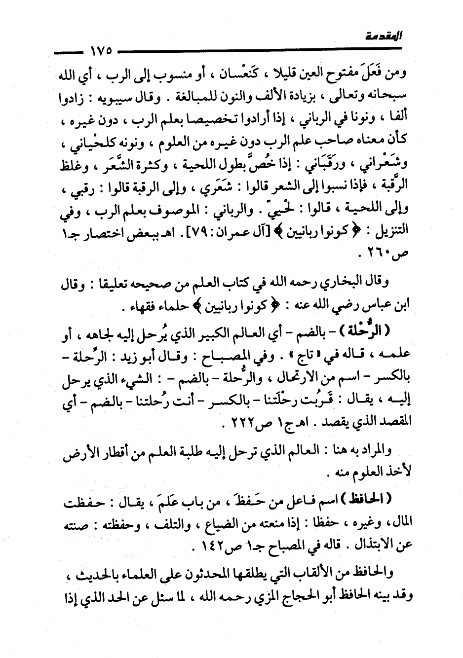 ومن فَعَلَ مفتوح العين قليلًا، كَنعْسان، أو منسوب إلى الرب، أي الله سبحانه وتعالى، بزيادة الألف والنون للمبالغة. وقال سيبويه: زادوا ألفا، ونونا في الرباني، إذا أرادوا تخصيصا بعلم الرب، دون غيره، كأن معناه صاحب علم الرب دون غيره من العلوم، ونونه كلحْياني، وشَعْراني، ورَقَبَاني: إذا خُصَّ بطول اللحية، وكثرة الشَّعَر، وغلظ الرَّقبة، فهذا نسبوا إلى الشعر قالوا: شَعَري، وإلى الرقبة قالوا: رقبي، وإلى اللحية، قالوا: لحْييّ. والرباني: الموصوف بعلم الرب، وفي التنزيل: {كُونُوا رَبَّانِيِّينَ} [آل عمران: 79]. اهـ ببعض اختصار جـ 1 ص260.