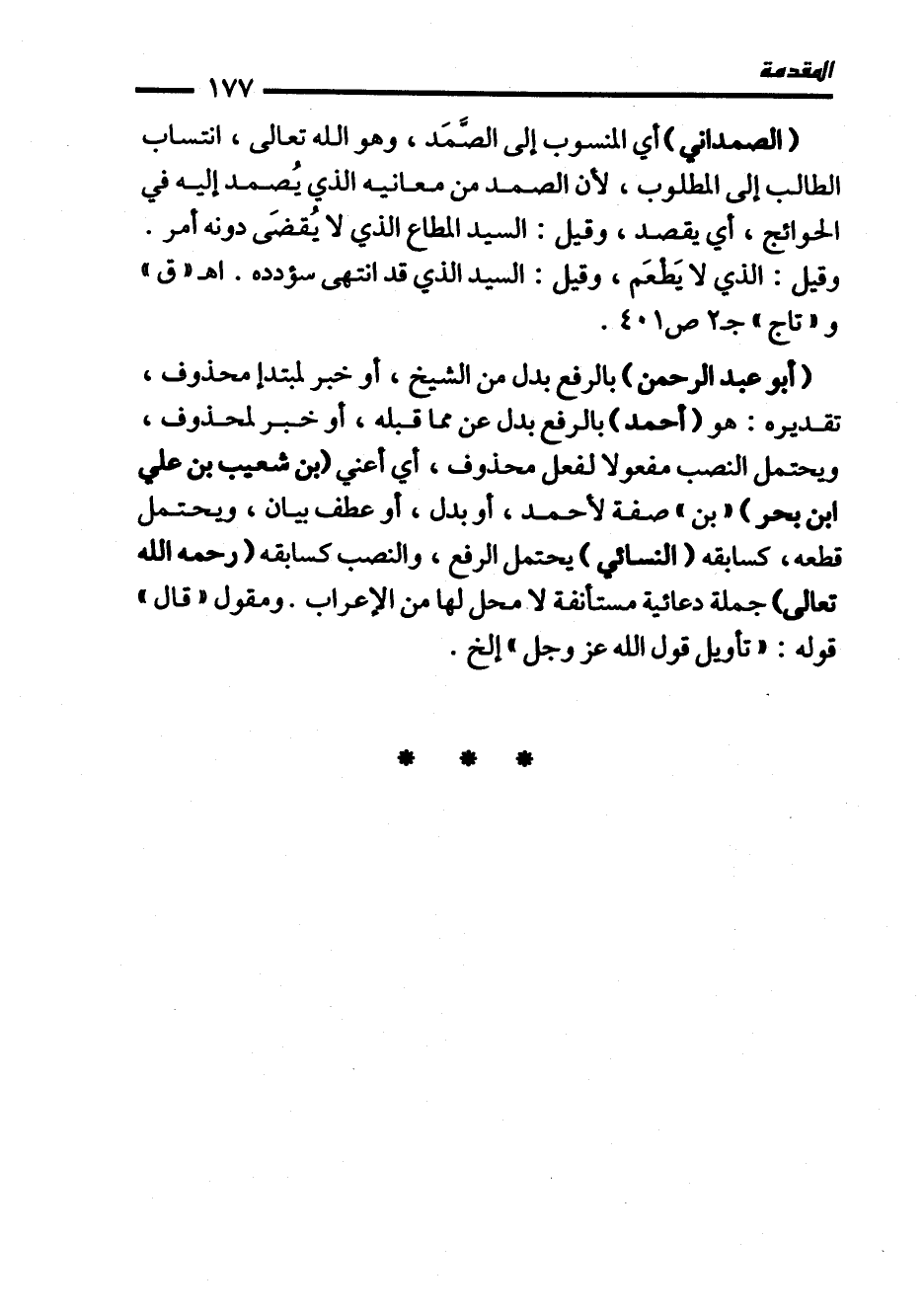(أبو عبد الرحمن) بالرفع بدل من الشيخ، أو خبر لمبتدإ محذوف، تقديره: هو (أحمد) بالرفع بدل عن مما قبله، أو خبر لمحذوف، ويحتمل النصب مفعولا لفعل محذوف، أي أعني (بن شعيب بن علي ابن بحر) "بن" صفة لأحمد، أو بدل، أو عطف بيان، ويحتمل قطعه، كسابقه (النسائي) يحتمل الرفع، والنصب كسابقه (رحمه الله تعال) جملة دعائية مستأنفة لا محل لها من الإعراب. ومقول "قال" قوله: "تأويل قول الله عز وجل" إلخ.