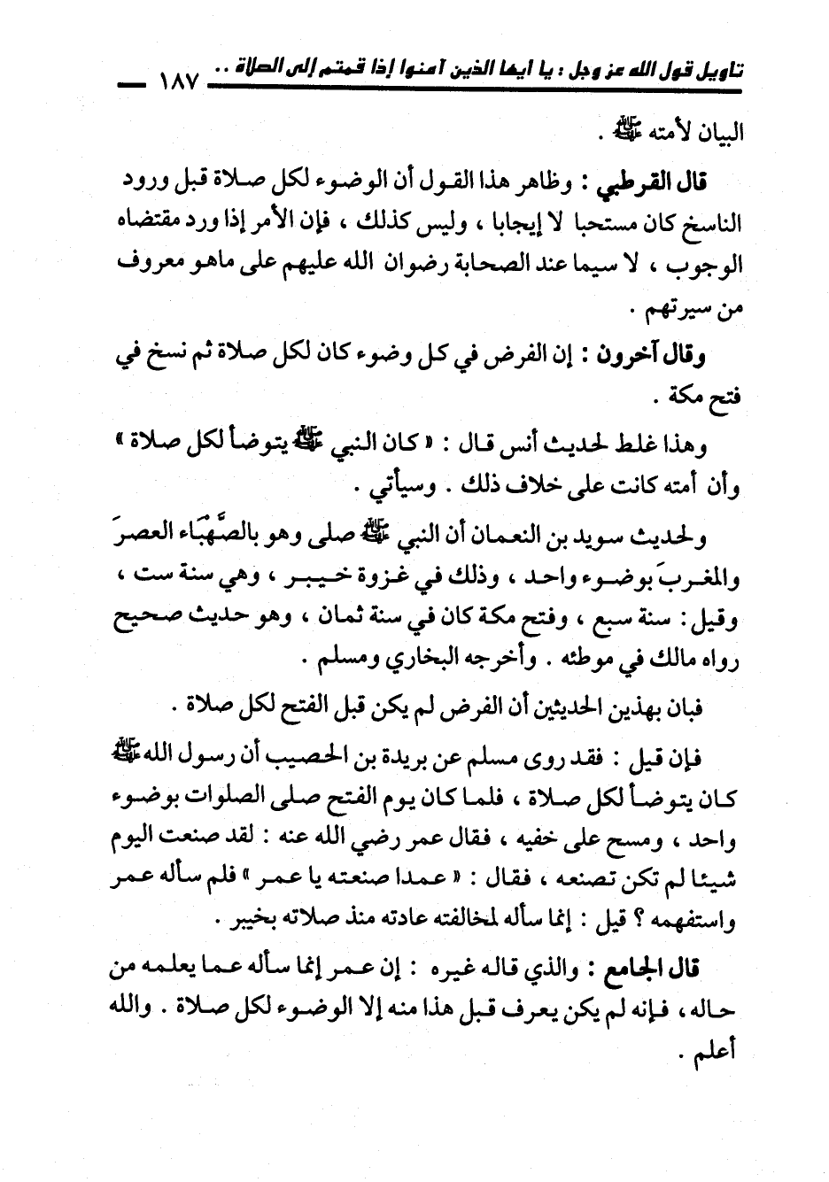 قال القرطبي: وظاهر هذا القول أن الوضوء لكل صلاة قبل ورود الناسخ كان مستحبا لا إيجابا، وليس كذلك، فإن الأمر إذا ورد مقتضاه الوجوب، لا سيما عند الصحابة رضوان الله عليهم على ما هو معروف من سيرتهم.
