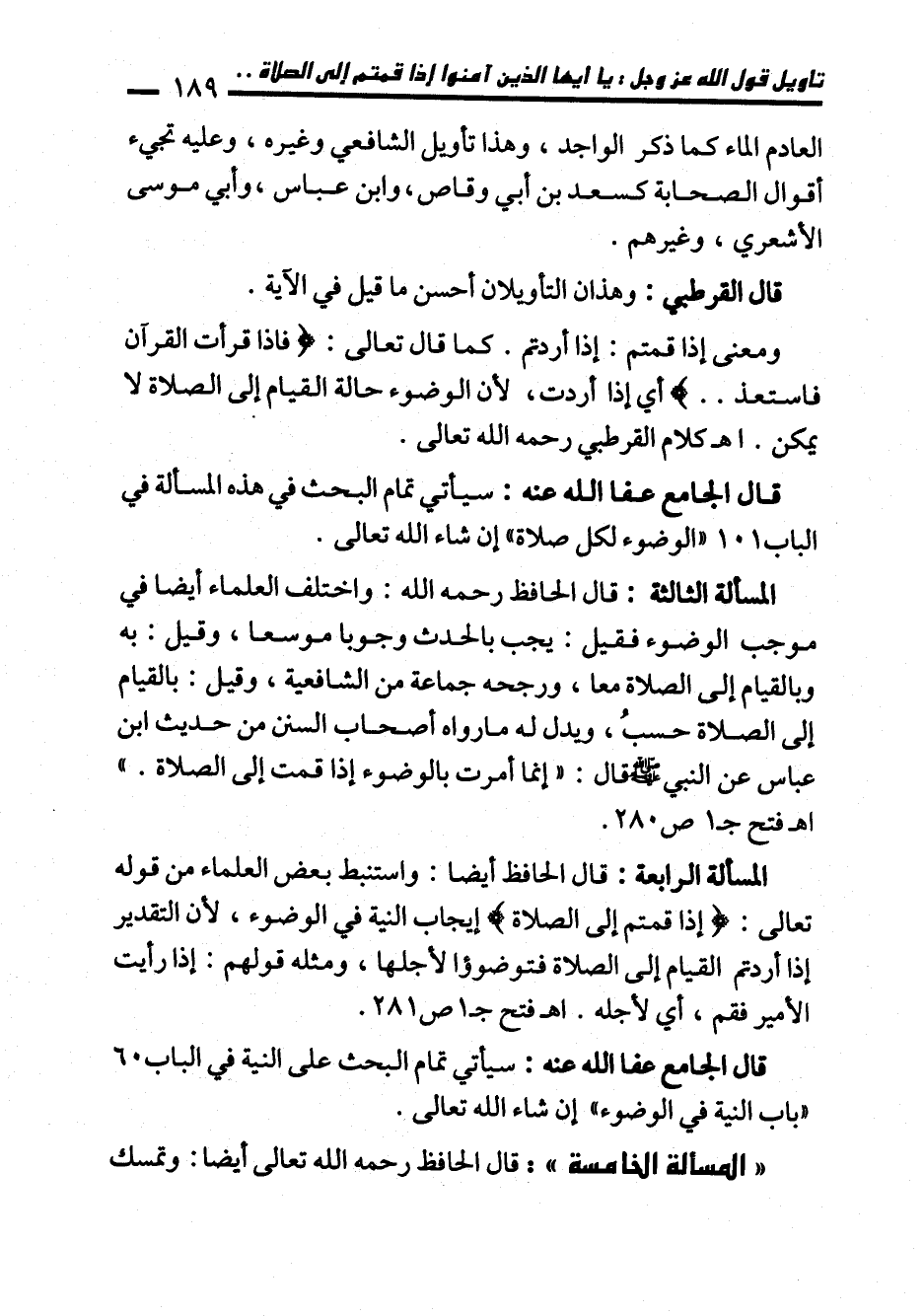 المسأله الرابعة: قال الحافظ أيضا: واستنبط بعض العلماء من قوله تعالى: {إذا قمتم إلى الصلاة} إيجاب النية في الوضوء؛ لأن التقدير إذا أردتم القيام إلى الصلاة فتوضوؤا لأجلها، ومثله قولهم: إذا رأيت