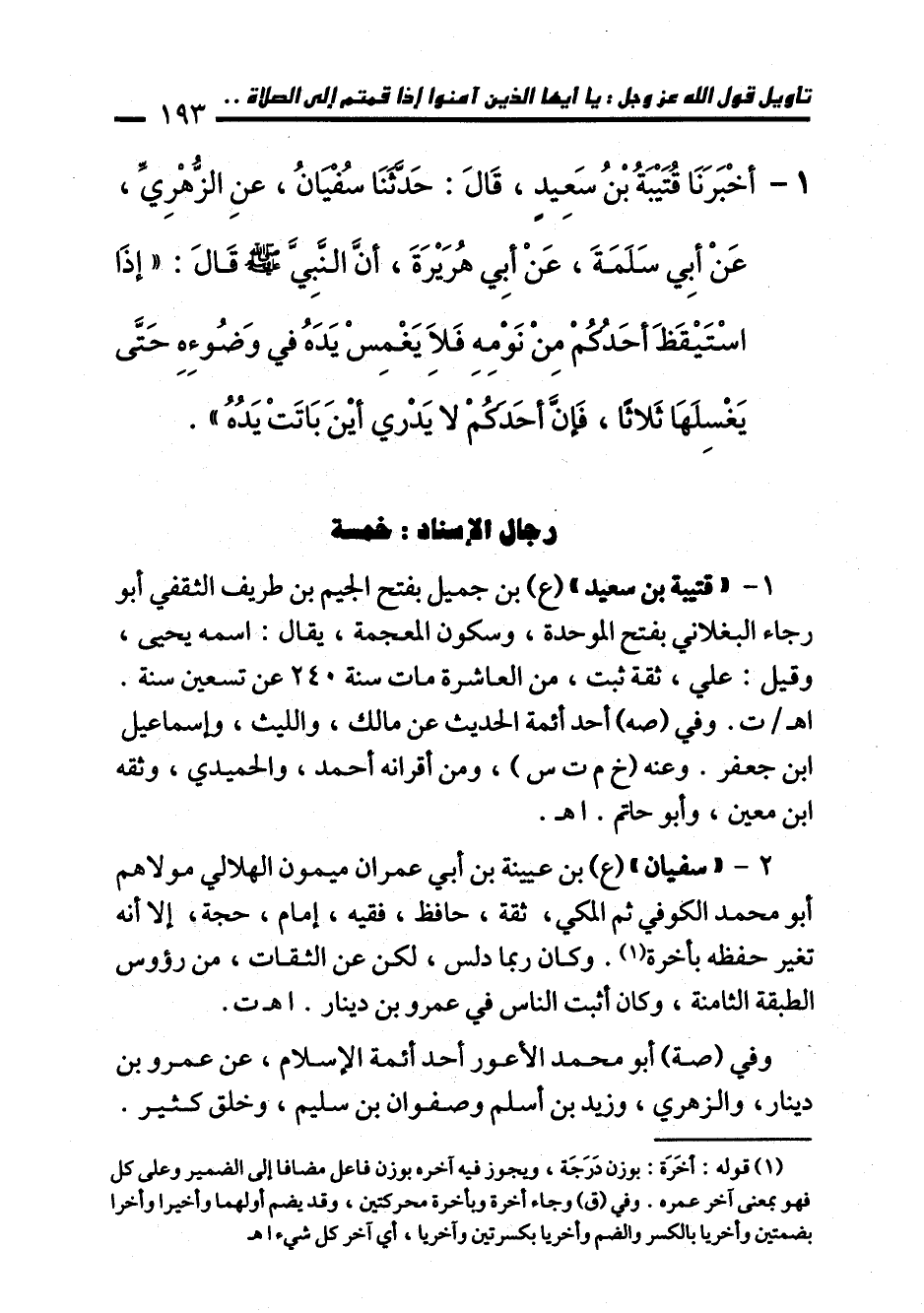 1 - أَخْبَرَنَا قُتَيْبَةُ بْنُ سَعِيدٍ، قَالَ: حَدَّثَنَا سُفْيَانُ، عَنِ الزُّهْرِيِّ، عَنْ أَبِي سَلَمَةَ، عَنْ أَبِي هُرَيْرَةَ، أَنَّ النَّبِيَّ - صلى الله عليه وسلم - قَالَ: "إِذَا اسْتَيْقَظَ أَحَدُكُمْ مِنْ نَوْمِهِ فَلاَ يَغْمِسْ يَدَهُ فِي وَضُوئِهِ حَتَّى يَغْسِلَهَا ثَلاَثًا، فَإِنَّ أَحَدَكُمْ لاَ يَدْرِي أَيْنَ بَاتَتْ يَدُهُ".