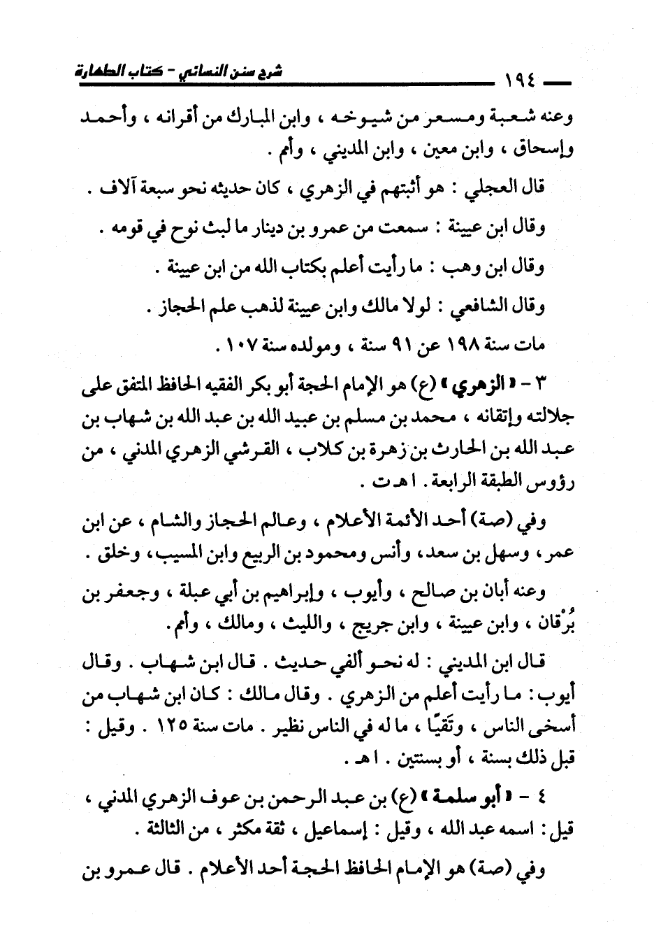 3 - "الزهري" (ع) هو الإمام الحجة أبو بكر الفقيه الحافظ المتفق على جلالته وإتقانه، محمَّد بن مسلم بن عبيد الله بن عبد الله بن شهاب بن عبد الله بن الحارث بن زهرة بن كلاب، القرشي الزهري المدني، من رؤوس الطبقة الرابعة. اهـ ت.