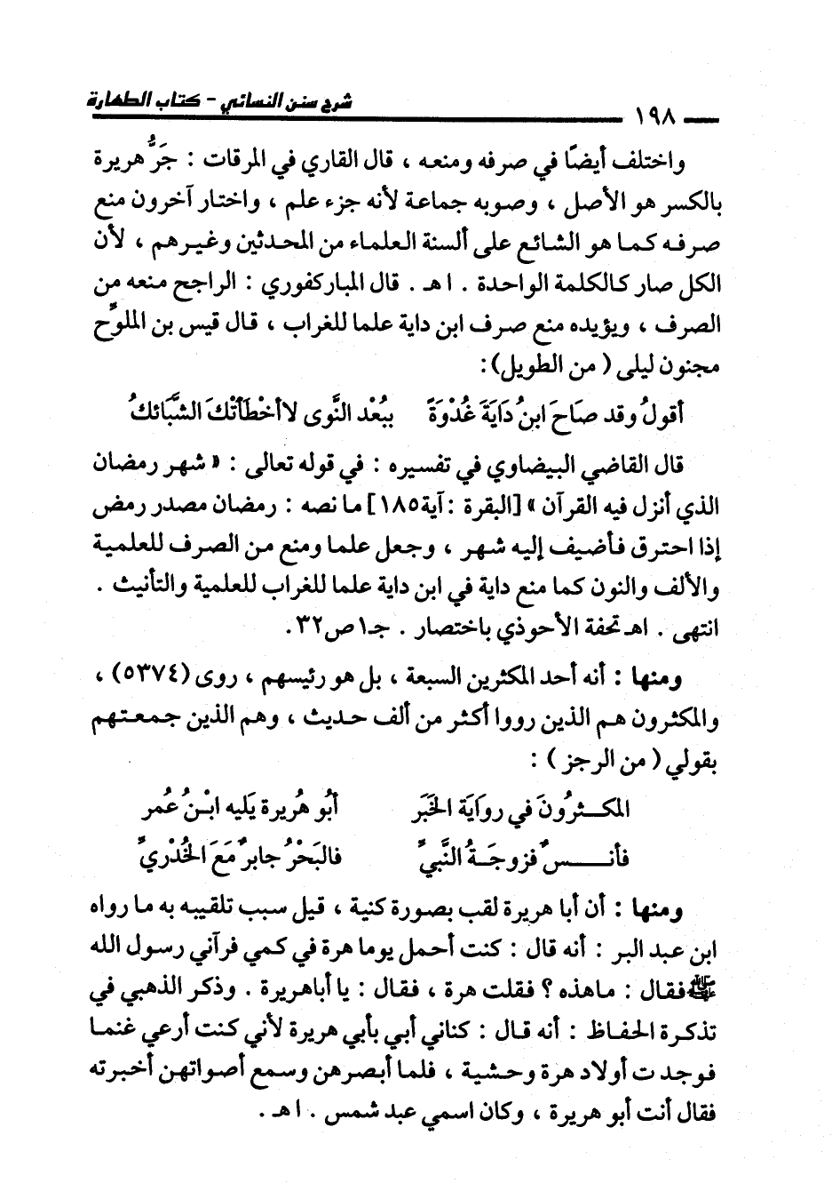 واختلف أيضًا في صرفه ومنعه، قال القاري في المرقات: جَرُّ هريرة بالكسر هو الأصل، وصوبه جماعة لأنه جزء علم، واختار آخرون منع صرفه كما هو الشائع على ألسنة العلماء من المحدثين وغيرهم؛ لأن الكل صار كالكلمة الواحدة. اهـ. قال المباركفوري: الراجح منعه من الصرف، ويؤيده منع صرف ابن داية علمًا للغراب، قال قيس بن الملوِّح مجنون ليلى (من الطويل):