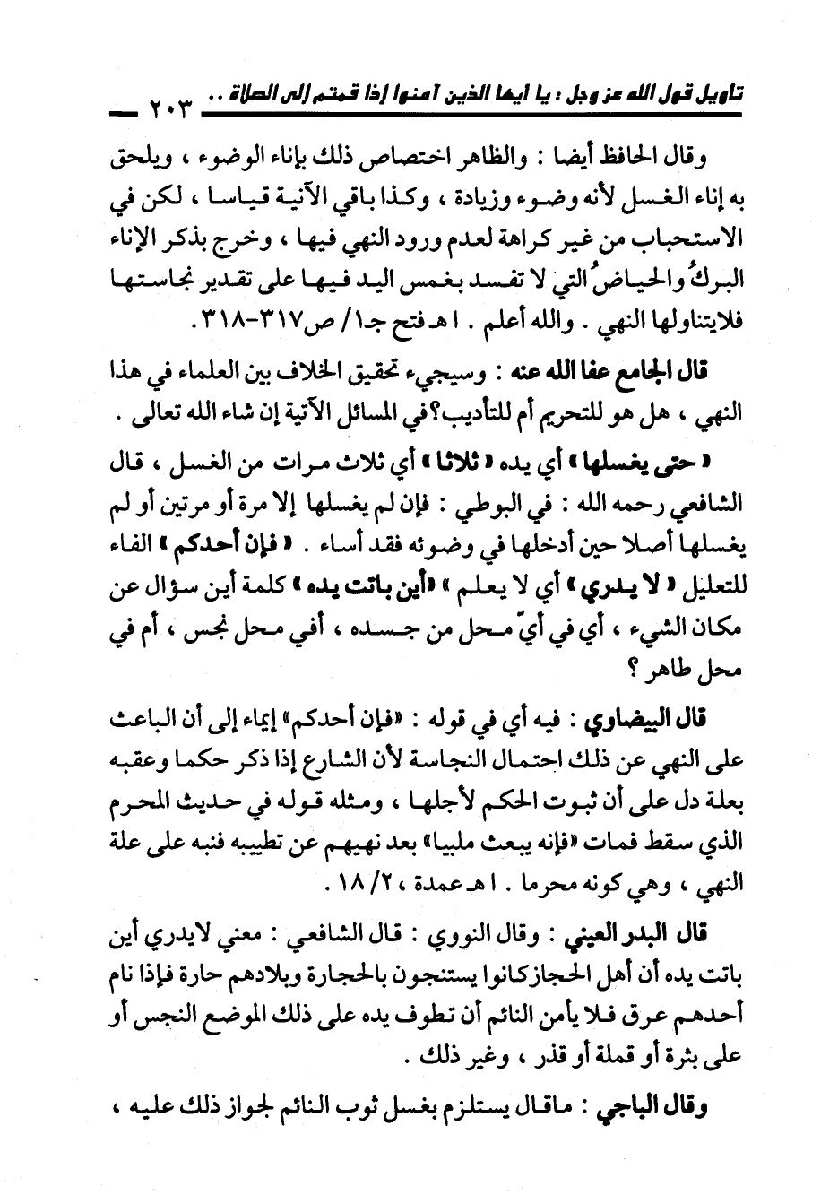 وقال الحافظ أيضا: والظاهر اختصاص ذلك بإناء الوضوء، ويلحق به إناء الغسل لأنه وضوء وزيادة، وكذا باقي الآنية قياسا، لكن في الاستحباب من غير كراهة لعدم ورود النهي فيها، وخرج بذكر الإناء البركُ والحياضُ التي لا تفسد بغمس اليد فيها على تقدير نجاستها فلا يتناولها النهي. والله أعلم. اهـ فتح جـ 1 / ص 317 - 318.