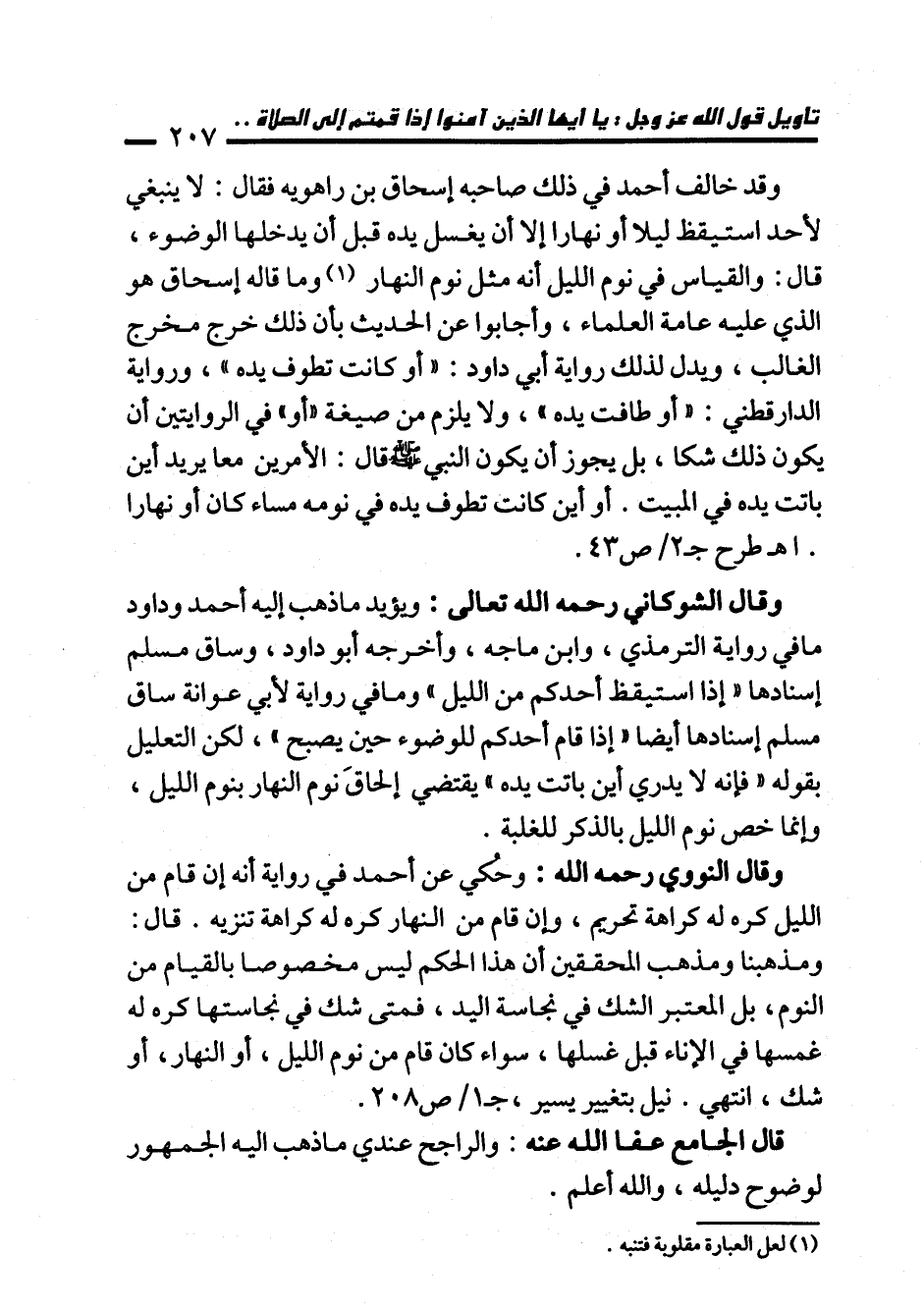 وقال الشوكاني رحمه الله تعالى: ويؤيد ما ذهب إليه أحمد وداود ما في رواية الترمذي، وابن ماجه، وأخرجه أبو داود، وساق مسلم إسنادها "إذا استيقظ أحدكم من الليل" وما في رواية لأبي عوانة ساق مسلم إسنادها أيضا "إذا قام أحدكم للوضوء حين يصبح"، لكن التعليل بقوله "فإنه لا يدري أين باتت يده" يقتضي إلحاقَ نوم النهار بنوم الليل، إنما خص نوم الليل بالذكر للغلبة.