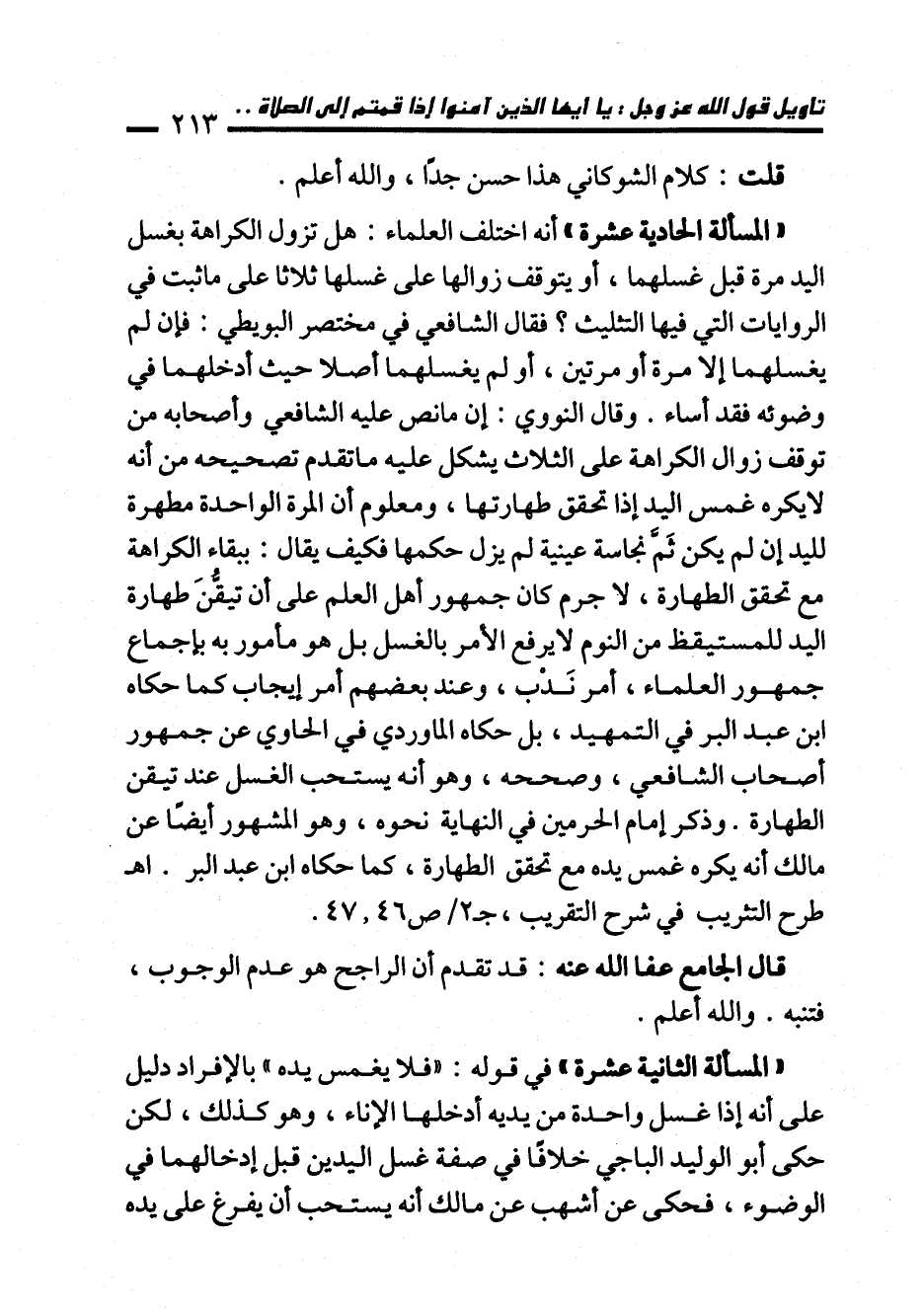 "المسألة الحادية عشرة" أنه اختلف العلماء: هل تزول الكراهة بغسل اليد مرة قبل غسلهما، أو يتوقف زوالها على غسلها ثلاثًا على ما ثبت في الروايات التي فيها التثليث؟ قال الشافعي في مختصر البويطي: فإن لم يغسلهما إلا مرة أو مرتين، أو لم يغسلهما أصلًا حيث أدخلهما في وضوئه فقد أساء. وقال النووي: إن ما نص عليه الشافعي وأصحابه من توقف زوال الكراهة على الثلاث يشكل عليه ما تقدم تصحيحه من أنه لا يكره غمس اليد إذا تحقق طهارتها، ومعلوم أن المرة الواحدة مطهرة لليد إن لم يكن ثَمَّ نجاسة عينية لم يزل حكمها فكيف يقال: ببقاء الكراهة مع تحقق الطهارة، لا جرم كان جمهور أهل العلم على أن تيقن طهارة اليد للمستيقظ من النوم لا يرفع الأمر بالغسل بل هو مأمور به بإجماع جمهور العلماء، أمر نَدْب، وعند بعضهم أمر إيجاب كما حكاه ابن عبد البر في التمهيد، بل حكاه الماوردي في الحاوي عن جمهور أصحاب الشافعي، وصححه، وهو أنه يستحب الغسل عند تيقن الطهارة. وذكر إمام الحرمين في النهاية نحوه، وهو المشهور أيضًا عن مالك أنه يكره غمس يده مع تحقق الطهارة، كما حكاه ابن عبد البر. اهـ طرح التثريب في شرح التقريب، جـ 2/ ص 46، 47.