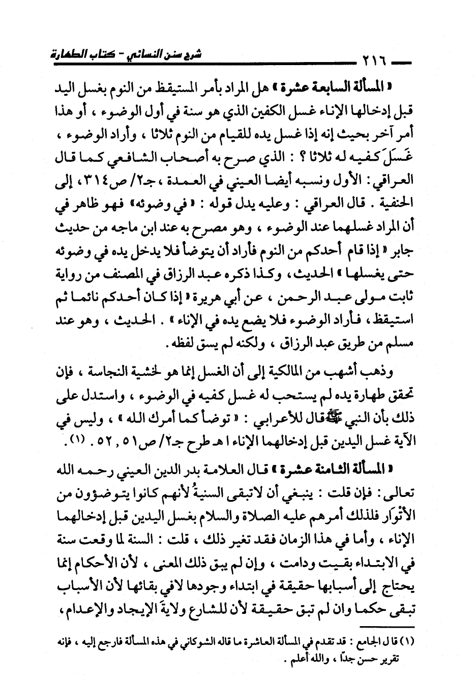 "المسألة السابعة عشرة" هل المراد بأمر المستيقظ من النوم بغسل اليد قبل إدخالها الإناء غسل الكفين الذي هو سنة في أول الوضوء، أو هذا أمر آخر بحيث إنه إذا غسل يده للقيام من النوم ثلاثا، وأراد الوضوء، غَسَلَ كفيه له ثلاثًا؟: الذي صرح به أصحاب الشافعي كما قال العراقي: الأول ونسبه أيضا العيني في العمدة، جـ 2/ ص 314، إلى الحنفية. قال العراقي: وعليه يدل قوله: "في وضوئه" فهو ظاهر في أن المراد غسلهما عند الوضوء، وهو مصرح به عند ابن ماجه من حديث جابر "إذا قام أحدكم من النوم فأراد أن يتوضأ فلا يدخل يده في وضوئه حتى يغسلها" الحديث، وكذا ذكره عبد الرزاق في المصنف من رواية ثابت مولى عبد الرحمن، عن أبي هريرة "إذا كان أحدكم نائما ثم استيقظ، فأراد الوضوء فلا يضع يده في الإناء". الحديث، وهو عند مسلم من طريق عبد الرزاق، ولكنه لم يسق لفظه.
