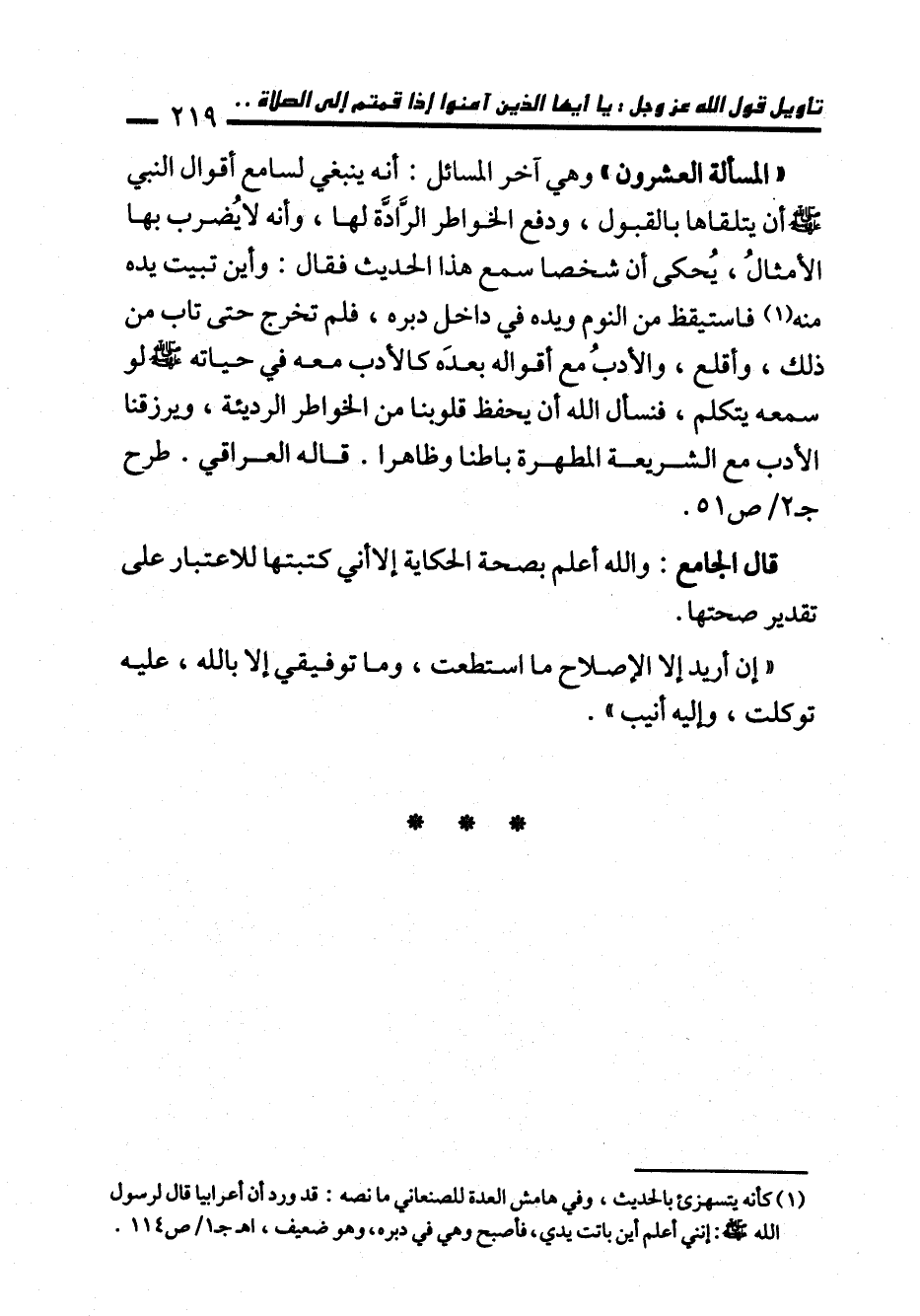 "المسألة العشرون" وهي آخر المسائل: أنه ينبغي لسامع أقوال النبي - صلى الله عليه وسلم - أن يتلقاها بالقبول، ودفع الخواطر الرَّادَّة لها، وأنه لا يُضرب بها الأمثالُ، يُحكى أن شخصا سمع هذا الحديث فقال: وأين تبيت يده منه (¬1) فاستيقظ من النوم ويده في داخل دبره، فلم تخرج حتى تاب من ذلك، وأقلع، والأدبُ مع أقواله بعدَه كالأدب معه في حياته - صلى الله عليه وسلم - لو سمعه يتكلم، فنسأل الله أن يحفظ قلوبنا من الخواطر الرديئة، ويرزقنا الأدب مع الشريعة المطهرة باطنا وظاهرًا. قاله العراقي. طرح جـ 2/ ص 51.