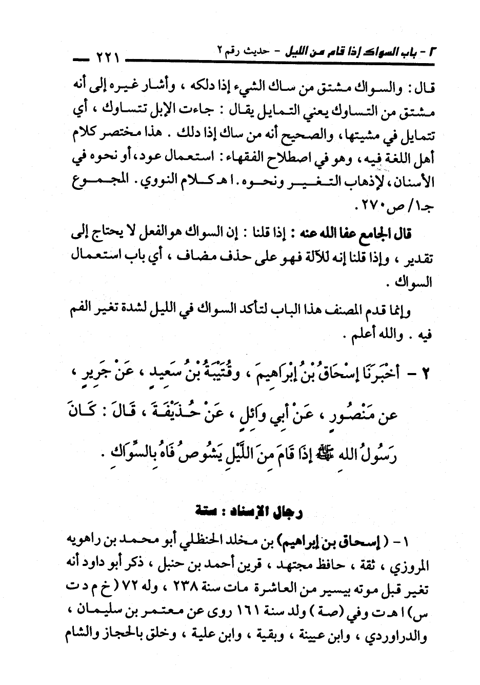 2 - أَخْبَرَنَا إِسْحَاقُ بْنُ إِبْرَاهِيمَ، وَقُتَيْبَةُ بْنُ سَعِيدٍ، عَنْ جَرِيرٍ، عَنْ مَنْصُورٍ، عَنْ أَبِي وَائِلٍ، عَنْ حُذَيْفَةَ، قَالَ: كَانَ رَسُولُ اللهِ - صلى الله عليه وسلم - إِذَا قَامَ مِنَ اللَّيْلِ يَشُوصُ فَاهُ بِالسِّوَاكِ.