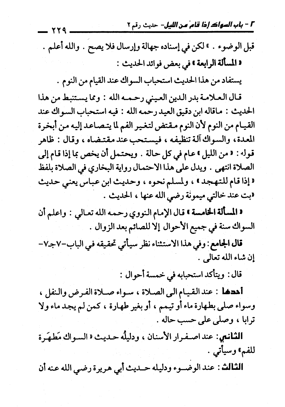 قال العلامة بدر الدين العيني رحمه الله: ومما يستنبط من هذا الحديث: ما قاله ابن دقيق العيد رحمه الله: فيه استحباب السواك عند القيام من النوم لأن النوم مقتض لتغير الفم لما يتصاعد إليه من أبخرة المعدة، والسواك آلة تنظيفه، فيستحب عند مقتضاه، وقال: ظاهر قوله: "من الليل" عام في كل حالة. ويحتمل أن يخص بما إذا قام إلى الصلاة انتهى. ويدل على هذا الاحتمال رواية البخاري في الصلاة بلفظ "إذا قام للتهجد"، ولمسلم نحوه، وحديث ابن عباس يعني حديث "بت عند خالتي ميمونة رضي الله عنها، الحديث.