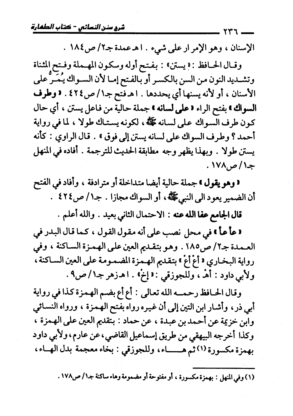 وقال الحافظ: "يستن": بفتح أوله وسكون المهملة وفتح المثناة وتشديد النون من السنن بالكسر أو بالفتح إما لأن السواك يُمَرُّ على الأسنان، أو لأنه يسنها أي يحددها. اهـ فتح جـ 1/ ص 424. "وطرف السواك" بفتح الراء "على لسانه" جملة حالية من فاعل يستن، أي حال كون طرف السواك على لسانه - صلى الله عليه وسلم -، لكونه يستاك طولا، لما في رواية أحمد؟ وطرف السواك على لسانه يستن إلى فوق". قال الراوي: كأنه يستن طولا. وبهذا يظهر وجه مطابقة الحديث للترجمة. أفاده في المنهل جـ 1/ ص 178.