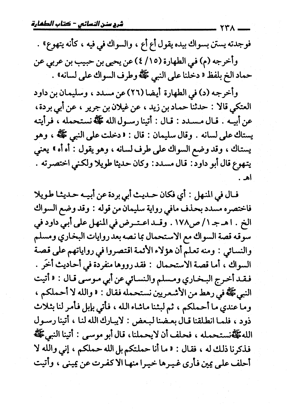 قال في المنهل: أي فكان حديث أبي بردة عن أبيه حديثا طويلًا فاختصره مسدد بحذف ما في رواية سليمان من قوله: وقد وضع السواك الخ. اهـ جـ 1/ ص 178. وقد اعترض في المنهل على أبو داود في سوقه قصة السواك مع الاستحمال بما نصه بعد روايات البخاري ومسلم والنسائي: ومنه تعلم أن هؤلاء الأئمة اقتصروا في رواياتهم على قصة السواك، أما قصة الاستحمال: فقد رووها منفردة في أحاديث أخَر.