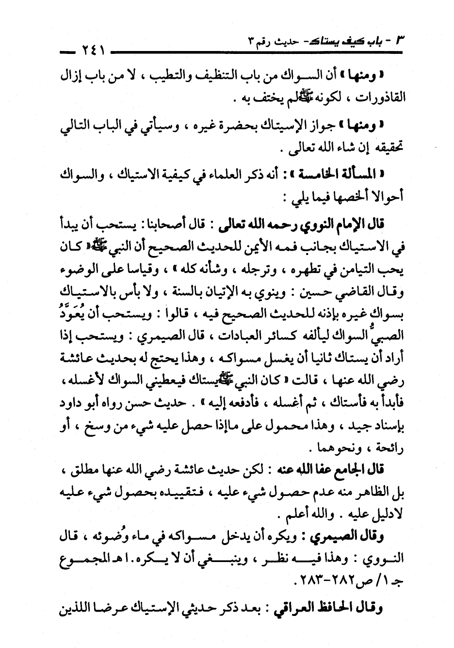 "ومنها" جواز الإسيتاك بحضرة غيره، وسيأتي في الباب التالي تحقيقه إن شاء الله تعالى.