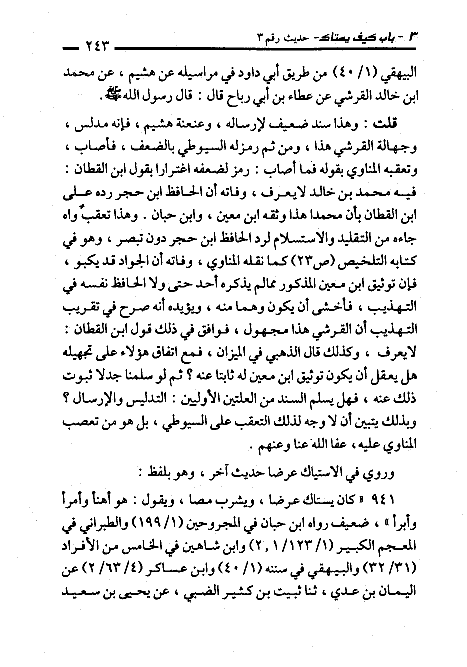 قلت: وهذا سند ضعيف لإرساله، وعنعنة هشيم، فإنه مدلس، وجهالة القرشي هذا، ومن ثم رمزله السيوطي بالضعف، فأصاب، وتعقبه المناوي بقوله فما أصاب: رمز لضعفه اغترارا بقول ابن القطان: فيه محمَّد بن خالد لا يعرف، وفاته أن الحافظ ابن حجر رده على ابن القطان بأن محمدا هذا وثقه ابن معين، وابن حبان. وهذا تعقبٌ واه جاءه من التقليد والاستسلام لرد الحافظ ابن حجر دون تبصر، وهو في كتابه التلخيص (ص 23) كما نقله المناوي، وفاته أن الجواد قد يكبو، فإن توثيق ابن معين المذكور مما لم يذكره أحد حتى ولا الحافظ نفسه في التهذيب، فأخشى أن يكون وهما منه، ويؤيده أنه صرح في تقريب التهذيب أن القرشي هذا مجهول، فوافق في ذلك قول ابن القطان: لا يعرف، وكذلك قال الذهبي في الميزان، فمع اتفاق هؤلاء على تجهيله هل يعقل أن يكون توثيق ابن معين له ثابتا عنه؟ ثم لو سلمنا جدلا ثبوت ذلك عنه، فهل يسلم السند من العلتين الأوليين: التدليس والإرسال؟ وبذلك يتبين أن لا وجه لذلك التعقب على السيوطي، بل هو من تعصب المناوي عليه، عفا الله عنا وعنهم.
