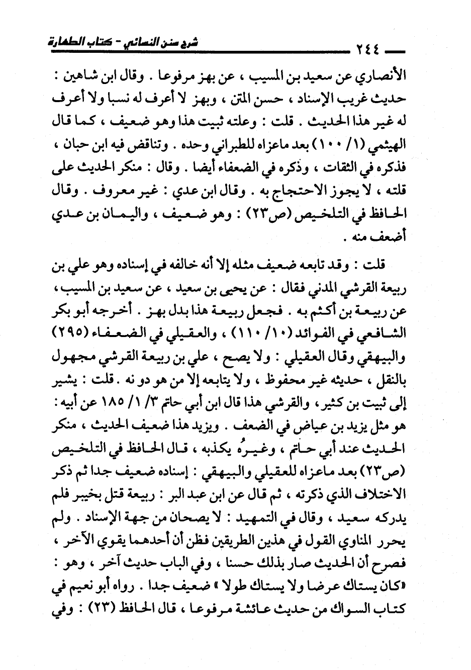 قلت: وقد تابعه ضعيف مثله إلا أنه خالفه في إسناده وهو علي بن ربيعة القرشي المدني فقال: عن يحيى بن سعيد، عن سعيد بن المسيب، عن ربيعة بن أكثم به. فجعل ربيعة هذا بدل بهز. أخرجه أبو بكر الشافعي في الفوائد (10/ 110)، والعقيلي في الضعفاء (295) والبيهقي وقال العقيلي: ولا يصح، علي بن ربيعة القرشي مجهول بالنقل، حديثه غير محفوظ، ولا يتابعه إلا من هو دونه. قلت: يشير إلى ثبيت بن كثير، والقرشي هذا قال ابن أبي حاتم 3/ 1/ 185 عن أبيه: هو مثل يزيد بن عياض في الضعف. ويزيد هذا ضعيف الحديث، منكر الحديث عند أبي حاتم، وغيرُه يكذبه، قال الحافظ في التلخيص (ص 23) بعد ما عزاه للعقيلي والبيهقي: إسناده ضعيف جدًا ثم ذكر الاختلاف الذي ذكرته، ثم قال عن ابن عبد البر: ربيعة قتل بخيبر فلم يدركه سعيد، وقال في التمهيد: لا يصحان من جهة الإسناد. ولم يحرر المناوي القول في هذين الطريقين فظن أن أحدهما يقوي الآخر، فصرح أن الحديث صار بذلك حسنا، وفي الباب حديث آخر، وهو: "كان يستاك عرضا ولا يستاك طولا" ضعيف جدا. رواه أبو نعيم في كتاب السواك من حديث عائشة مرفوعا، قال الحافظ (23): وفي