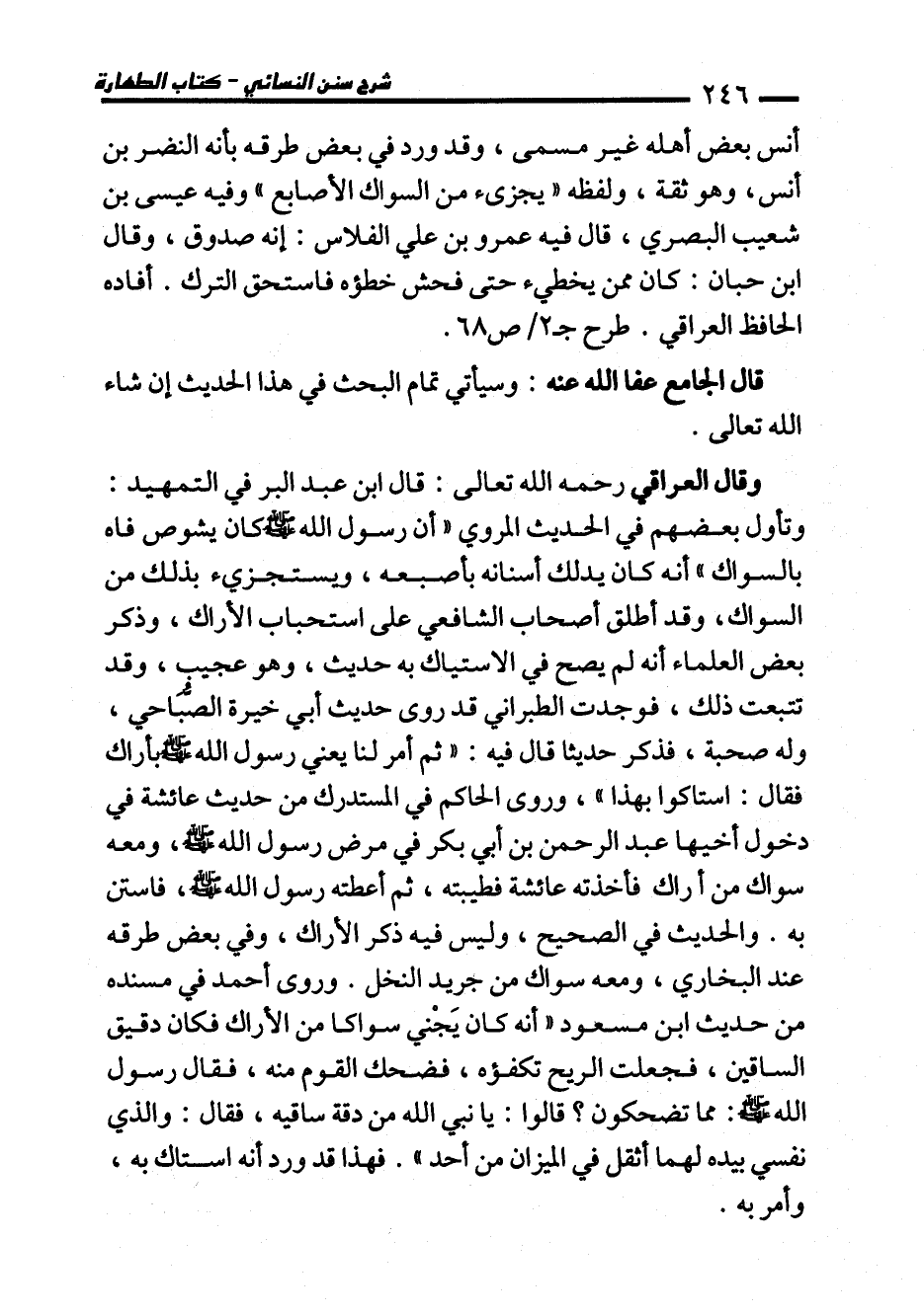 وقال العراقى رحمه الله تعالى: قال ابن عبد البر في التمهيد: وتأول بعضهم في الحديث المروي "أن رسول الله - صلى الله عليه وسلم - كان يشوص فاه بالسواك" أنه كان يدلك أسنانه بأصبعه، ويستجزيء بذلك من السواك، وقد أطلق أصحاب الشافعي على استحباب الأراك، وذكر بعض العلماء أنه لم يصح في الاستياك به حديث، وهو عجيب، وقد تتبعت ذلك، فوجدت الطبراني قد روى حديث أبي خيرة الصُّبَاحي، وله صحبة، فذكر حديثا قال فيه: "ثم أمر لنا يعني رسول الله - صلى الله عليه وسلم - بأراك فقال: استاكوا بهذا"، وروى الحاكم في المستدرك من حديث عائشة في دخول أخيها عبد الرحمن بن أبي بكر في مرض رسول الله - صلى الله عليه وسلم -، ومعه سواك من أراك فأخذته عائشة فطيبته، ثم أعطته رسول الله - صلى الله عليه وسلم -، فاستن به. والحديث في الصحيح، وليس فيه ذكر الأراك، وفي بعض طرقه عند البخاري، ومعه سواك من جريد النخل. وروى أحمد في مسنده من حديث ابن مسعود "أنه كان يَجْني سواكا من الأراك فكان دقيق الساقين، فجعلت الريح تكفؤه، فضحك القوم منه، فقال رسول الله - صلى الله عليه وسلم -: مما تضحكون؟ قالوا: يا نبي الله من دقة ساقيه، فقال: والذي نفسي بيده لهما أثقل في الميزان من أحد". فهذا قد ورد أنه استاك به، وأمر به.