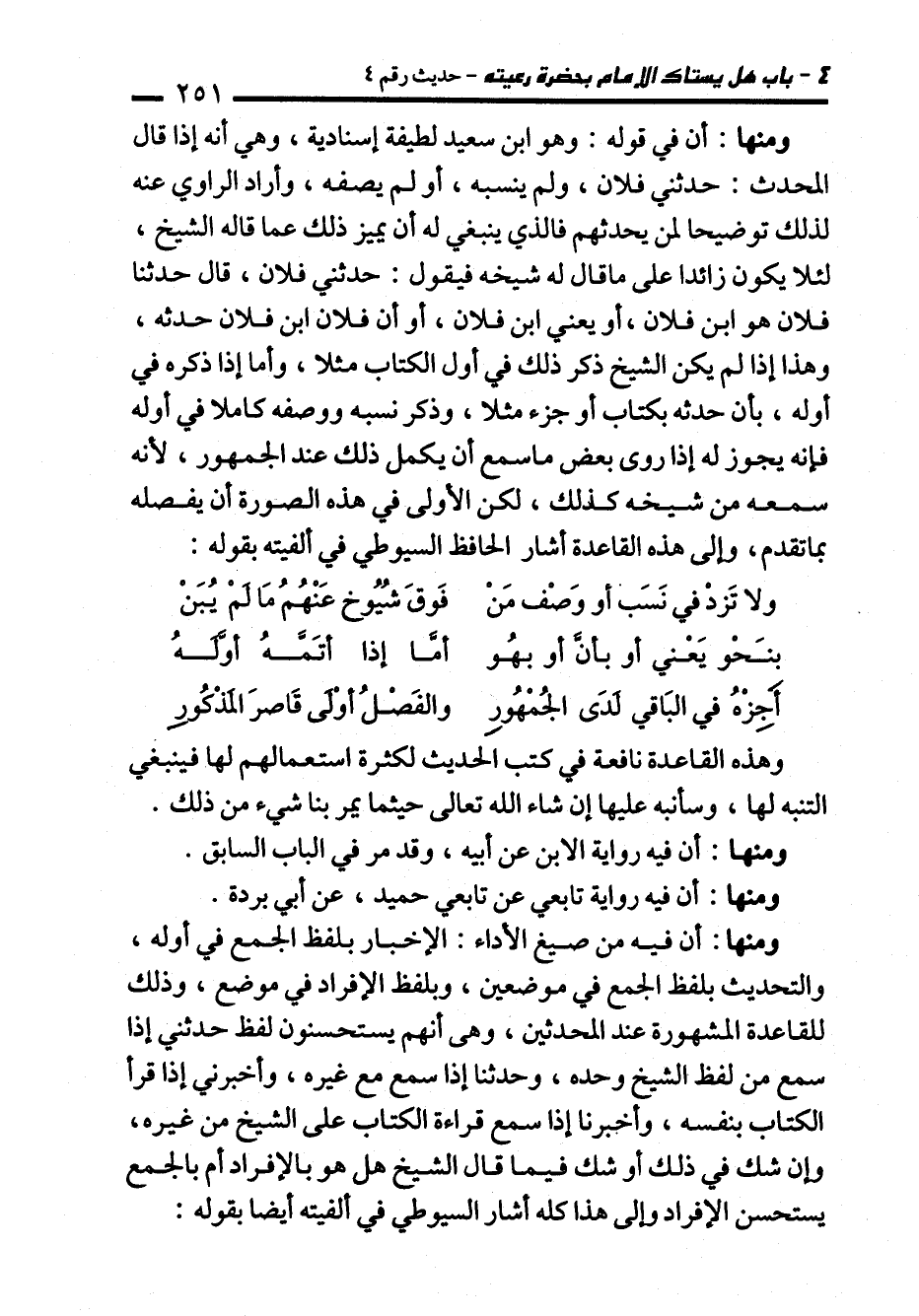 ومنها: أن في قوله: وهو ابن سعيد لطيفة إسنادية، وهي أنه إذا قال المحدث: حدثني فلان، ولم ينسبه، أو لم يصفه، وأراد الراوي عنه لذلك توضيحا لمن يحدثهم فالذي ينبغي له أن يميز ذلك عما قاله الشيخ، لئلا يكون زائدا على ما قال له شيخه فيقول: حدثني فلان، قال حدثنا فلان هو ابن فلان، أو يعني ابن فلان، أو أن فلان ابن فلان حدثه، وهذا إذا لم يكن الشيخ ذكر ذلك في أول الكتاب مثلا، وأما إذا ذكره في أوله، بأن حدثه بكتاب أو جزء مثلا، وذكر نسبه ووصفه كاملا في أوله فإنه يجوز له إذا روى بعض ما سمع أن يكمل ذلك عند الجمهور؛ لأنه سمعه من شيخه كذلك، لكن الأولى في هذه الصورة أن يفصله بما تقدم، وإلى هذه القاعدة أشار الحافظ السيوطي في ألفيته بقوله: