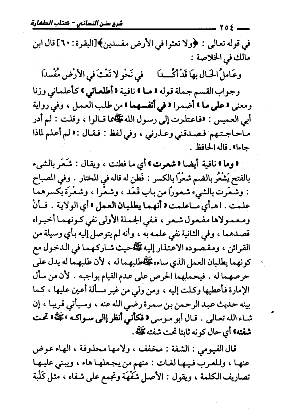 "وما" نافية أيضا "شعرت" أي ما فطنت، ويقال: شَعَر بالشىء بالفتح يَشْعُر بالضم شعْرًا بالكسر: فَطن له قاله في المختار. وفي المصباح: وشعَرت بالشيء شعورًا من باب قَعَد، وشعْرا، وشعْرَة بكسرهما علمت. اهـ أي ما علمت "أنهما يطلبان العمل" أي الولاية. فأنْ ومعمولاها مفعول شعر، ففي الجملة الأولى نفي كونهما أخبراه قصدهما، وفي الثانية نفي علمه به، وأنه لم يتوصل إليه بأي وسيلة من القرائن، ومقصوده الاعتذار إليه - صلى الله عليه وسلم - حيث شاركهما في الدخول مع كونهما يطلبان العمل الذي ساءه - صلى الله عليه وسلم - طلبهما له؛ لأن طلبهما له يدل على حرصهما له. فيحملهما الحرص على عدم القيام بواجبه. لأن من سأل الإمارة فأعطيها وكلت إليه، ومن ولي من غير مسألة أعين عليها، كما بينه حديث عبد الرحمن بن سمرة رضي الله عنه، وسيأتي قريبا، إن شاء الله تعالى. قال أبو موسى "فكأني انظر إلى سواكه" - صلى الله عليه وسلم - "تحت شفته" أي حال كونه ثابتا تحت شفته - صلى الله عليه وسلم -.