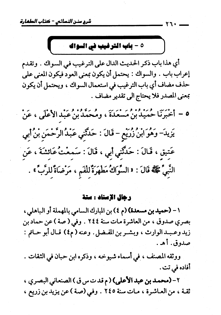 5 - أَخْبَرَنَا حُمَيْدُ بْنُ مَسْعَدَةَ، وَمُحَمَّدُ بْنُ عَبْدِ الأَعْلَى، عَنْ يَزِيدَ -وَهُوَ ابْنُ زُرَيْعٍ- قَالَ: حَدَّثَنِي عَبْدُ الرَّحْمَنِ بْنُ أَبِي عَتِيقٍ، قَالَ: حَدَّثَنِي أَبِي، قَالَ: سَمِعْتُ عَائِشَةَ عَنِ النَّبِيِّ -صلى الله عليه وسلم- قَالَ: "السِّوَاكُ مَطْهَرَةٌ لِلْفَمِ مَرْضَاةٌ لِلرَّبِّ".