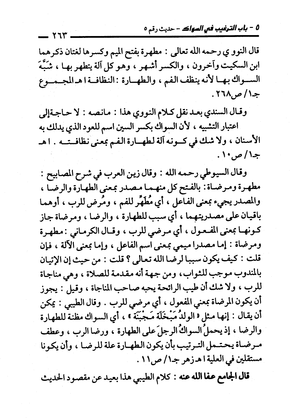 وقال السندي بعد نقل كلام النووي هذا: ما نصه: لا حاجة إلى اعتبار التشبيه؛ لأن السواك بكسر السين اسم للعود الذي يدلك به الأسنان، ولا شك في كونه آلة لطهارة الفم بمعنى نظافته. اهـ جـ 1 / ص 10.