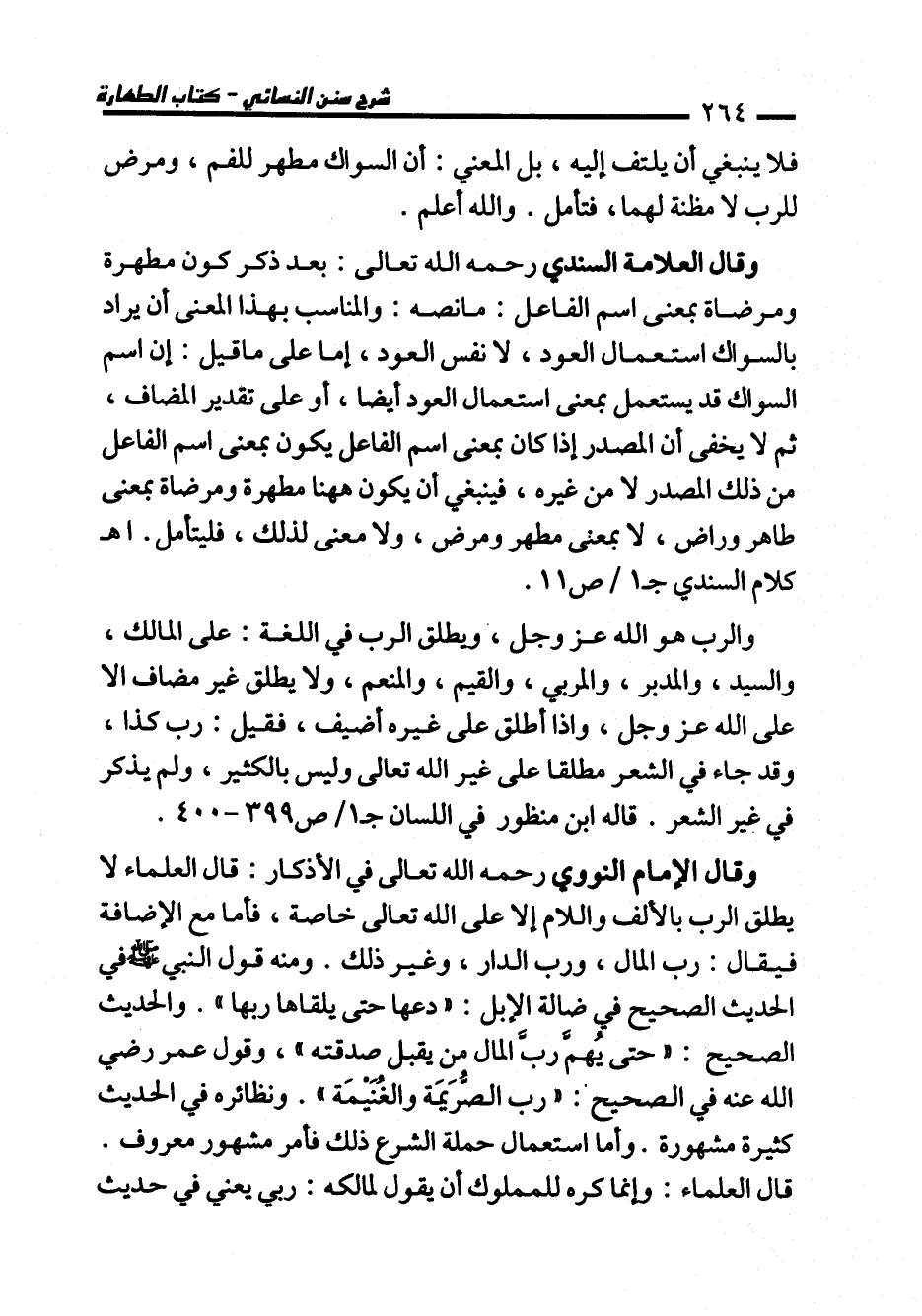 وقال الإمام النووي رحمه الله تعالى في الأذكار: قال العلماء لا يطلق الرب بالألف واللام إلا على الله تعالى خاصة، فأما مع الإضافة فيقال: رب المال، ورب الدار، وغير ذلك. ومنه قول النبي - صلى الله عليه وسلم - في الحديث الصحيح في ضالة الإبل: "دعها حتى يلقاها ربها". والحديث الصحيح: "حتى يُهمَّ ربَّ المال من يقبل صدقته"، وقول عمر رضي الله عنه في الصحيح: "رب الصُّرَيمَة والغُنَيْمَة". ونظائره في الحديث كثيرة مشهورة. وأما استعمال حملة الشرع ذلك فأمر مشهور معروف. قال العلماء: وإنما كره للمملوك أن يقول لمالكه: ربي يعني في حديث