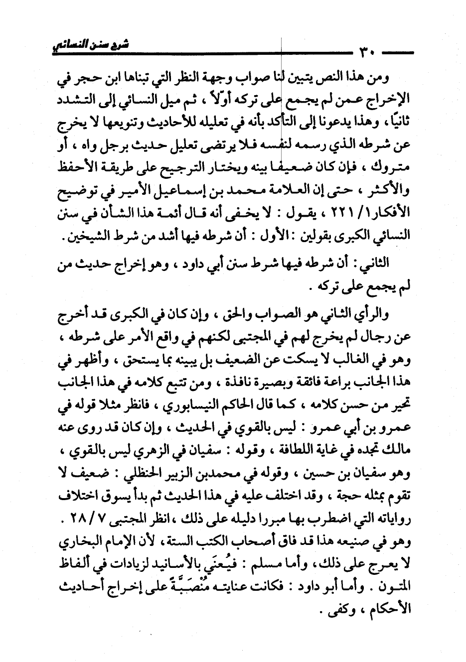 ومن هذا النص يتبين لنا صواب وجهة النظر التي تبناها ابن حجر في الإخراج عمن لم يجمع على تركه أوّلًا، ثم ميل النسائي إلى التشدد ثانيًا، وهذا يدعونا إلى التأكد بأنه في تعليله للأحاديث وتنويعها لا يخرج عن شرطه الذي رسمه لنفسه فلا يرتضى تعليل حديث برجل واه، أو متروك، فإن كان ضعيفًا بينه ويختار الترجيح على طريقة الأحفظ والأكثر، حتى إن العلامة محمَّد بن إسماعيل الأمير في توضيح الأفكار 1/ 221، يقول: لا يخفى أنه قال أئمة هذا الشأن في سنن النسائي الكبرى بقولين: الأول: أن شرطه فيها أشد من شرط الشيخين.