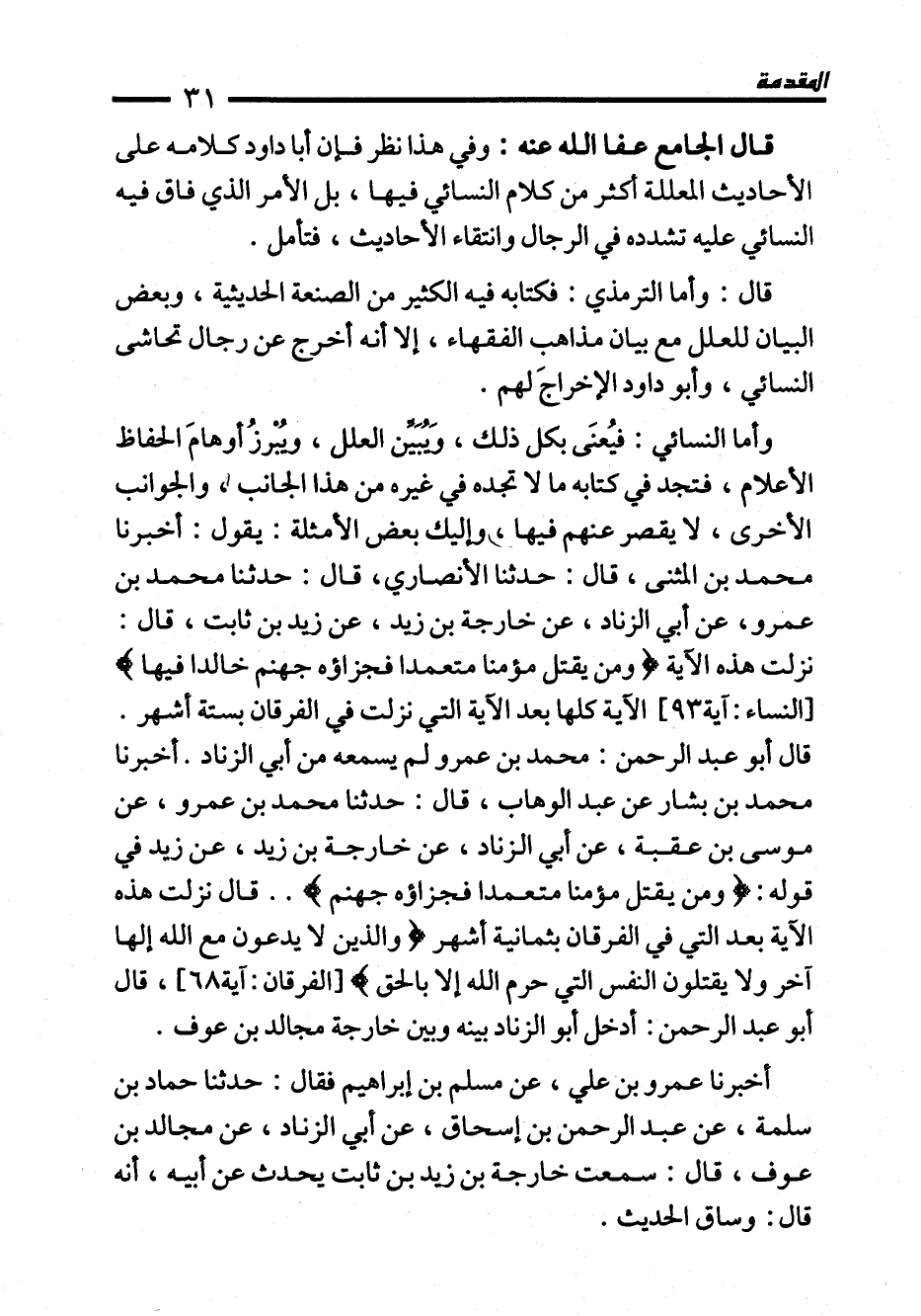 وأما النسائي: فيُعنَى بكل ذلك، وَيُبَيِّن العلل، ويُبْرزُ أوهامَ الحفاظ الأعلام، فتجد في كتابه ما لا تجده في غيره من هذا الجانب، والجوانب الأخرى، لا يقصر عنهم فيها، وإليك بعض الأمثلة: يقول: أخبرنا محمَّد بن المثنى، قال: حدثنا الأنصاري، قال: حدثنا محمَّد بن عمرو، عن أبي الزناد، عن خارجة بن زيد، عن زيد بن ثابت، قال: نزلت هذه الآية {وَمَنْ يَقْتُلْ مُؤْمِنًا مُتَعَمِّدًا فَجَزَاؤُهُ جَهَنَّمُ خَالِدًا فِيهَا} [النساء: آية 93] الآية كلها بعد الآية التي نزلت في الفرقان بستة أشهر. قال أبو عبد الرحمن: محمَّد بن عمرو لم يسمعه من أبي الزناد. أخبرنا محمَّد بن بشار عن عبد الوهاب، قال: حدثنا محمَّد بن عمرو، عن موسى بن عقبة، عن أبي الزناد، عن خارجة بن زيد، عن زيد في قوله: {وَمَنْ يَقْتُلْ مُؤْمِنًا مُتَعَمِّدًا فَجَزَاؤُهُ جَهَنَّمُ} .. قال نزلت هذه الآية بعد التي في الفرقان بثمانية أشهر {وَالَّذِينَ لَا يَدْعُونَ مَعَ اللَّهِ إِلَهًا آخَرَ وَلَا يَقْتُلُونَ النَّفْسَ الَّتِي حَرَّمَ اللَّهُ إِلَّا بِالْحَقِّ} [الفرقان: آية 68]، قال أبو عبد الرحمن: أدخل أبو الزناد بينه وبين خارجة مجالد بن عوف.
