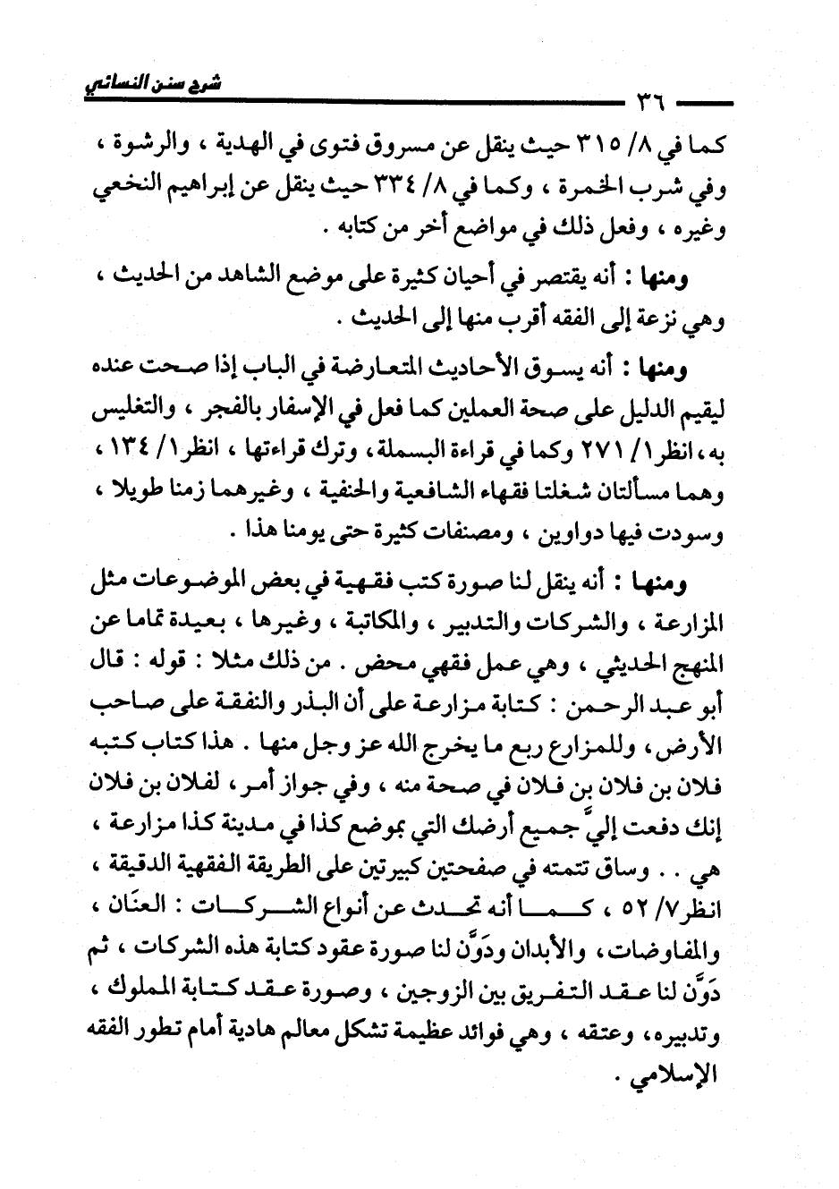 ومنها: أنه ينقل لنا صورة كتب فقهية في بعض الموضوعات مثل المزارعة، والشركات والتدبير، والمكاتبة، وغيرها، بعيدة تماما عن المنهج الحديثي، وهي عمل فقهي محض. من ذلك مثلا: قوله: قال أبو عبد الرحمن: كتابة مزارعة على أن البذر والنفقة على صاحب الأرض، وللمزارع ربع ما يخرج الله عز وجل منها. هذا كتاب كتبه فلان بن فلان بن فلان في صحة منه، وفي جواز أمر، لفلان بن فلان إنك دفعت إليَّ جميع أرضك التي بموضع كذا في مدينة كذا مزارعة، هي .. وساق تتمته في صفحتين كبيرتين على الطريقة الفقهية الدقيقة، انظر 7/ 52، كما أنه تحدث عن أنواع الشركات: العنَان، والمفاوضات، والأبدان ودَوَّن لنا صورة عقود كتابة هذه الشركات، ثم دَوَّن لنا عقد التفريق بين الزوجين، وصورة عقد كتابة المملوك، وتدبيره، وعتقه، وهي فوائد عظيمة تشكل معالم هادية أمام تطور الفقه الإسلامي.