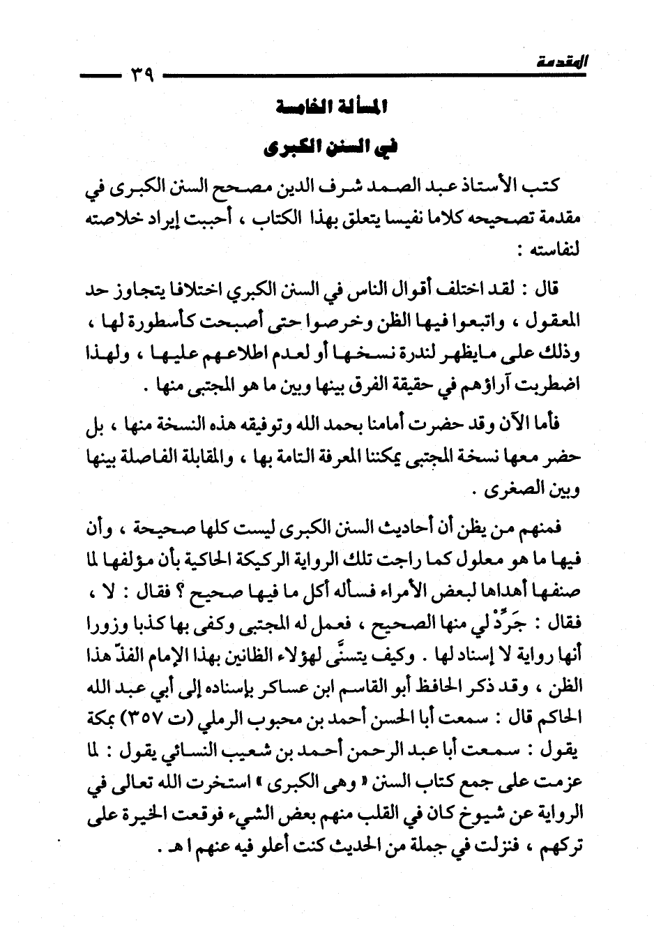 قال: لقد اختلف أقوال الناس في السنن الكبري اختلافا يتجاوز حد المعقول، واتبعوا فيها الظن وخرصوا حتى أصبحت كأسطورة لها، وذلك على ما يظهر لندرة نسخها أو لعدم اطلاعهم عليها، ولهذا اضطربت آراؤهم في حقيقة الفرق بينها وبين ما هو المجتبى منها.