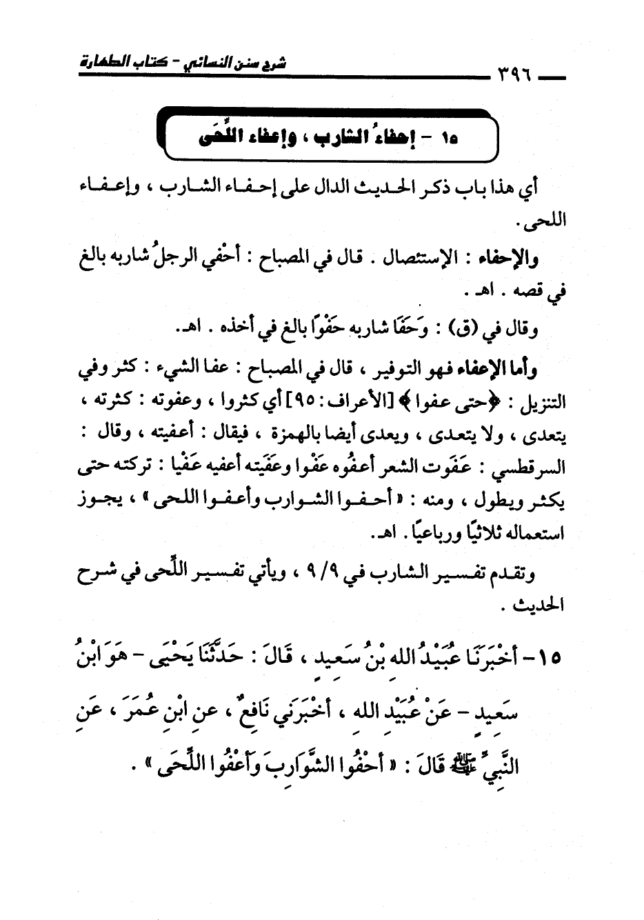 15 - أَخْبَرَنَا عُبَيْدُ اللهِ بْنُ سَعِيدٍ، قَالَ: حَدَّثَنَا يَحْيَى -هُوَ ابْنُ سَعِيدٍ- عَنْ عُبَيْدِ اللهِ، أَخْبَرَنِي نَافِعٌ، عَنِ ابْنِ عُمَرَ عَنِ النَّبِيِّ - صلى الله عليه وسلم - قَالَ: "أَحْفُوا الشَّوَارِبَ وَأَعْفُوا اللِّحَى".