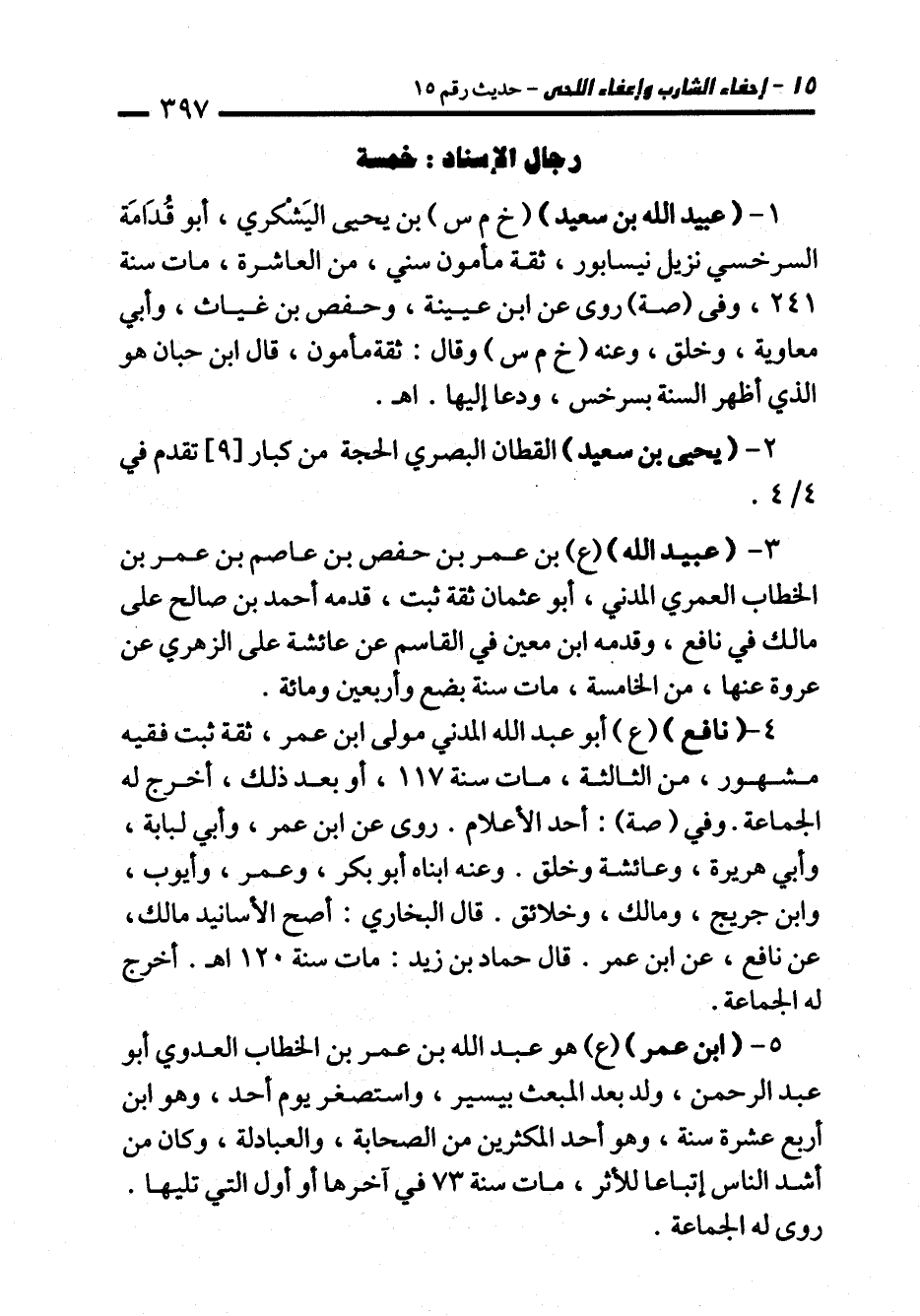 4 - (نافع) (ع) أبو عبد الله المدني مولى ابن عمر، ثقة ثبت فقيه مشهور، من الثالثة، مات سنة 117، أو بعد ذلك، أخرج له الجماعة. وفي (صة): أحد الأعلام. روى عن ابن عمر، وأبي لبابة، وأبي هريرة، وعائشة وخلق. وعنه ابناه أبو بكر، وعمر، وأيوب، وابن جريج، ومالك، وخلائق. قال البخاري: أصح الأسانيد مالك، عن نافع، عن ابن عمر. قال حماد بن زيد: مات سنة 120 اهـ. أخرج له الجماعة.
