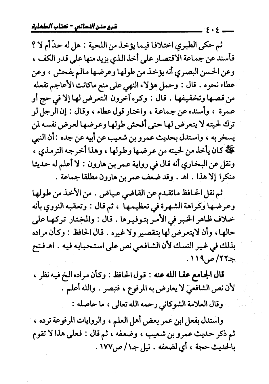 ثم نقل الحافظ ما تقدم عن القاضي عياض. من الأخذ من طولها وعرضها وكراهة الشهرة في تعظيمها، ثم قال: وتعقبه النووي بأنه خلاف ظاهر الخبر في الأمر بتوفيرها. قال: والمختار تركها على حالها، وأن لا يتعرض لها بتقصير ولا غيره. قال الحافظ: وكان مراده بذلك في غير النسك لأن الشافعي نص على استحبابه فيه. اهـ فتح جـ 22/ ص 119.