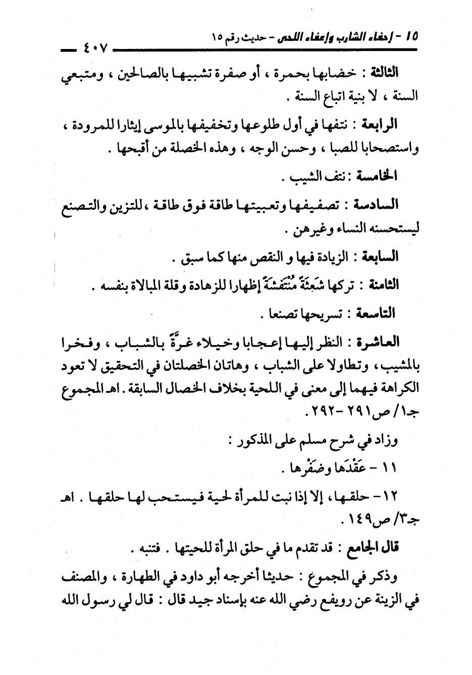 وذكر في المجموع: حديثا أخرجه أبو داود في الطهارة، والمصنف في الزينة عن رويفع رضي الله عنه بإسناد جيد قال: قال لي رسول الله