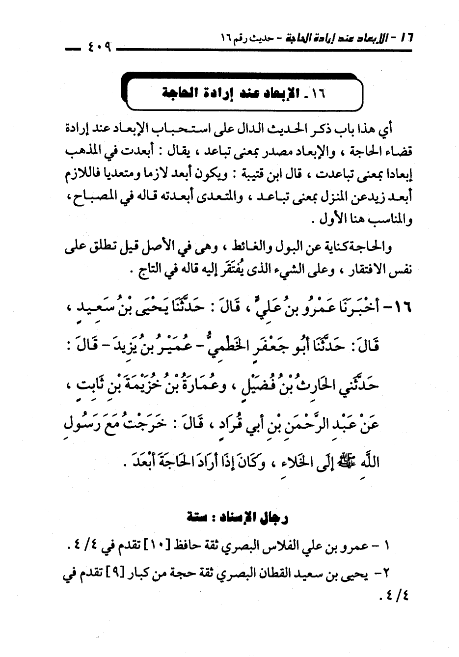 16 - أَخْبَرَنَا عَمْرُو بْنُ عَلِيٍّ، قَالَ: حَدَّثَنَا يَحْيَى بْنُ سَعِيدٍ، قَالَ: حَدَّثَنَا أَبُو جَعْفَرٍ الْخَطْمِيُّ -عُمَيْرُ بْنُ يَزِيدَ- قَالَ: حَدَّثَنِي الْحَارِثُ بْنُ فُضَيْلٍ، وَعُمَارَةُ بْنُ خُزَيْمَةَ بْنِ ثَابِتٍ، عَنْ عَبْدِ الرَّحْمَنِ بْنِ أَبِي قُرَادٍ قَالَ: خَرَجْتُ مَعَ رَسُولِ اللهِ - صلى الله عليه وسلم - إِلَى الْخَلاَءِ وَكَانَ إِذَا أَرَادَ الْحَاجَةَ أَبْعَدَ. رجال الإسناد: ستة