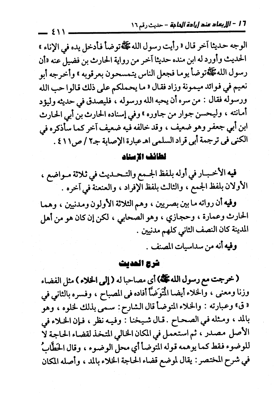 وفيه أن رواته ما بين بصريين، وهم الثلاثة الأولون ومدنيين، وهما الحارث وعمارة، وحجازي، وهو الصحابي، لكن إن كان هو من أهل المدينة كان النصف الثاني كلهم مدنيين.