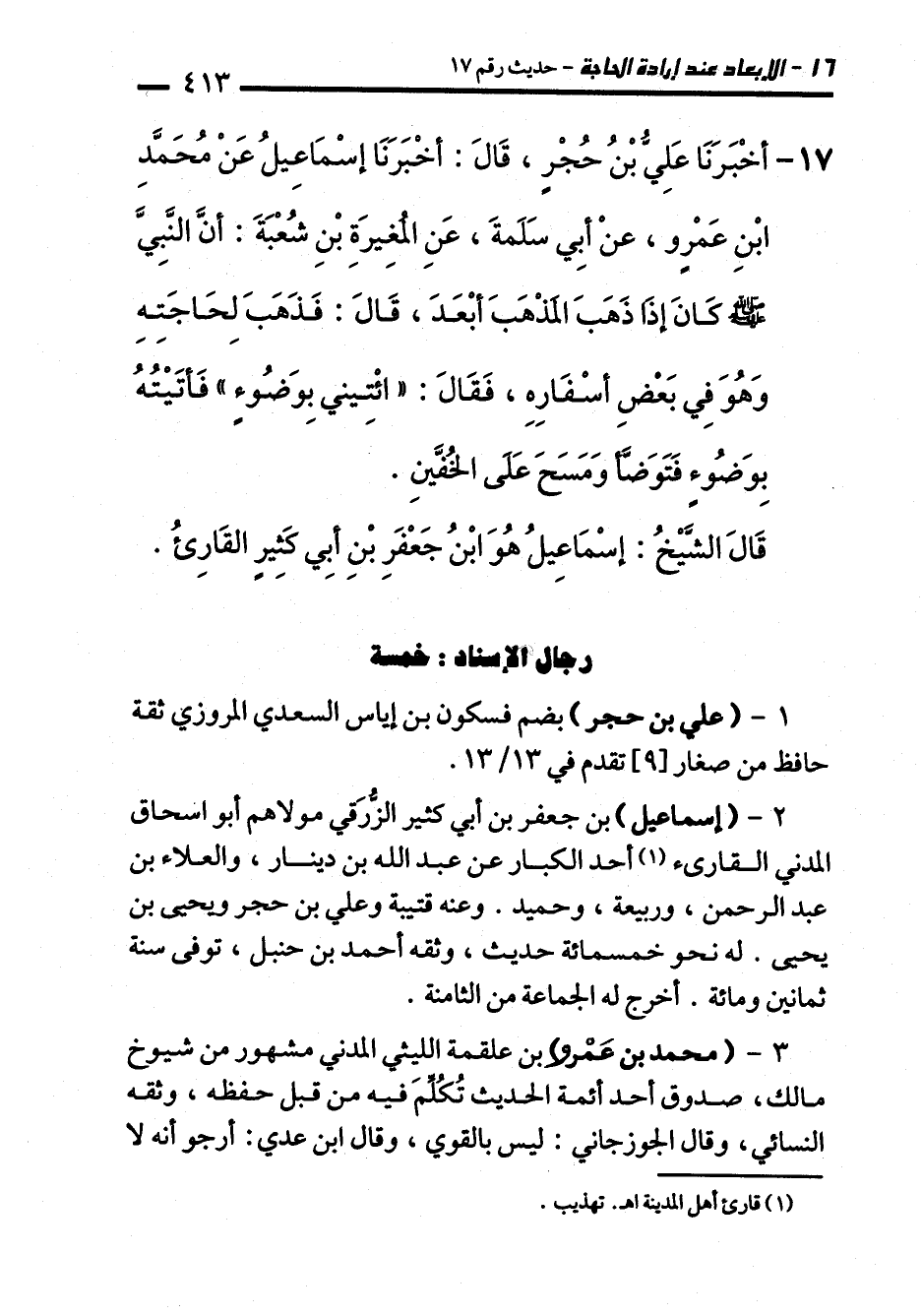 17 - أَخْبَرَنَا عَلِيُّ بْنُ حُجْرٍ، قَالَ: أَخْبَرَنَا إِسْمَاعِيلُ عَنْ مُحَمَّدِ بْنِ عَمْرٍو، عَنْ أَبِي سَلَمَةَ، عَنِ الْمُغِيرَةِ بْنِ شُعْبَةَ: أَنَّ النَّبِيَّ -صلى الله عليه وسلم- كَانَ إِذَا ذَهَبَ الْمَذْهَبَ أَبْعَدَ، قَالَ: فَذَهَبَ لِحَاجَتِهِ وَهُوَ فِي بَعْضِ أَسْفَارِهِ، فَقَالَ: "ائْتِنِي بِوَضُوءٍ". فَأَتَيْتُهُ بِوَضُوءٍ فَتَوَضَّأَ وَمَسَحَ عَلَى الْخُفَّيْنِ.
