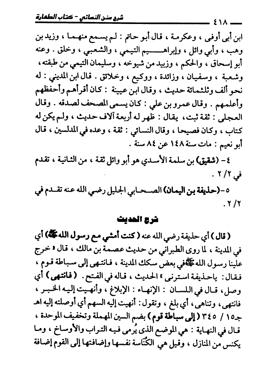 (قال) أي حذيفة رضي الله عنه (كنت أمشي مع رسول الله - صلى الله عليه وسلم -) أي في المدينة، لما روى الطبراني من حديث عصمة بن مالك، قال "خرج علينا رسول الله - صلى الله عليه وسلم - في بعض سكك المدينة، فانتهى إلى سباطة قوم، فقال: يا حذيفة استرنى" الحديث، قاله في الفتح. (فانتهى) أي وصل، قال في اللسان: الإنهاء: الإبلاغ، وأنهيت إليه الخبر، فانتهى، وتناهى، أي بلغ، وتقول: أنهيت إليه السهم أي أوصلته إليه اهـ جـ 15/ 345 (إلى سباطة قوم) بضم السين المهملة وتخفيف الموحدة، قال في النهاية: هي الموضع الذى يُرمى فيه التراب والأوساخ، وما يكنس من المنازل، وقيل هي الكُنَاسة نفسها وإضافتها إلى القوم إضافة