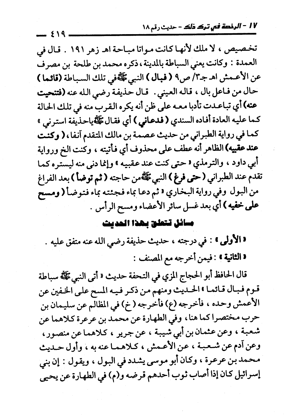 قال الحافظ أبو الحجاج المزي في التحفة حديث "أتى النبي - صلى الله عليه وسلم - سباطة قوم فبال قائما" الحديث ومنهم من ذكر فيه المسح على الخفين عن الأعمش وحده، فأخرجه (ع) فأخرجه (خ) في المظالم عن سليمان بن حرب مختصرا كما هنا، وفي الطهارة عن محمَّد بن عرعرة كلاهما عن شعبة، وعن عثمان بن أبي شيبة، عن جرير، كلاهما عن منصور، وعن آدم عن شعبة، عن الأعمش، كلاهما عنه به، وأول حديث محمَّد بن عرعرة، وكان أبو موسى يشدد في البول، ويقول: إن بني إسرائيل كان إذا أصاب ثوب أحدهم قرضه و (م) في الطهارة عن يحيى