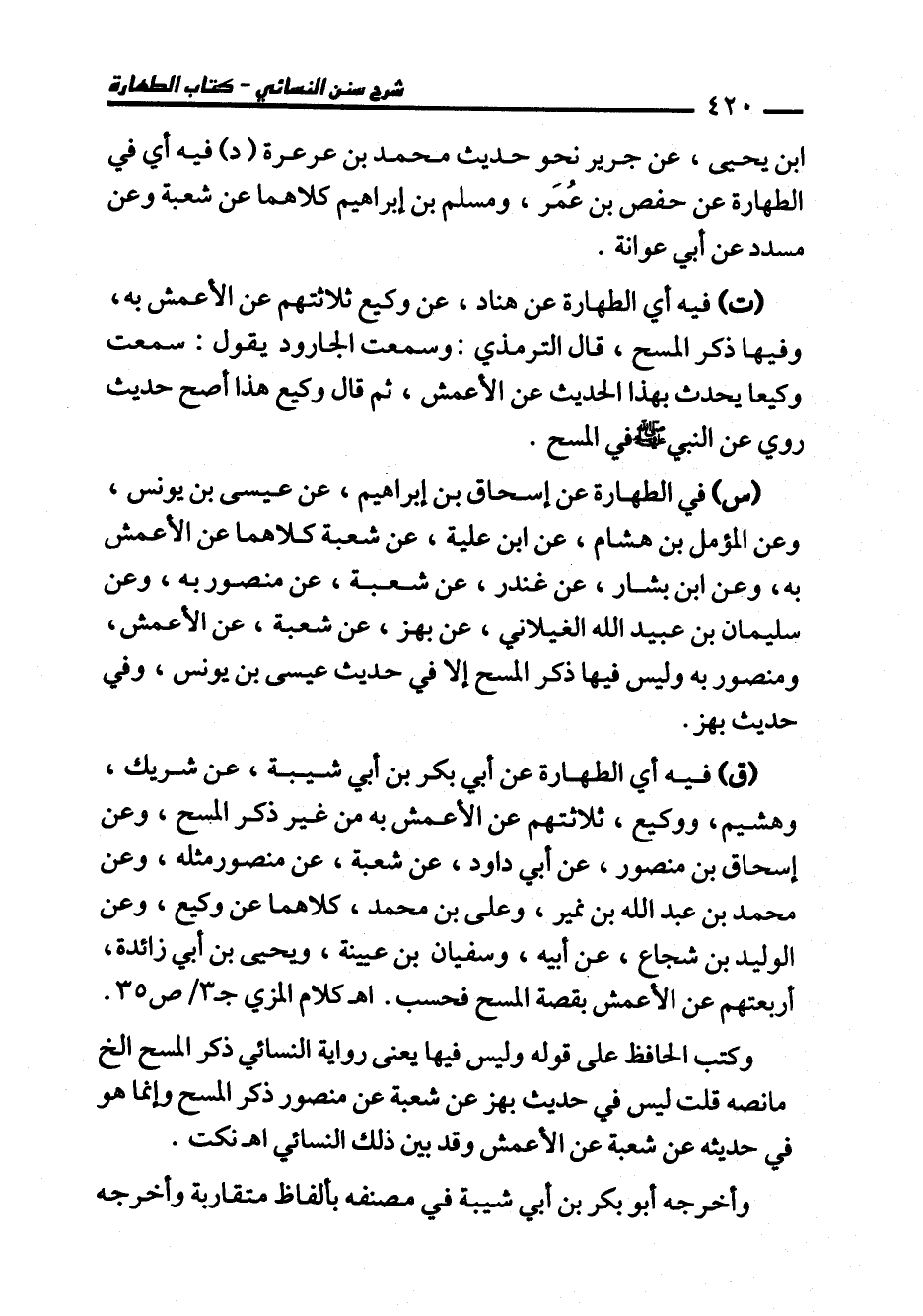 (ق) فيه أي الطهارة عن أبي بكر بن أبي شيبة، عن شريك، وهشيم، ووكيع، ثلاثتهم عن الأعمش به من غير ذكر المسح، وعن إسحاق بن منصور، عن أبي داود، عن شعبة، عن منصور مثله، وعن محمَّد بن عبد الله بن نمير، وعلي بن محمَّد، كلاهما عن وكيع، وعن الوليد بن شجاع، عن أبيه، وسفيان بن عيينة، ويحيى بن أبي زائدة، أربعتهم عن الأعمش بقصة المسح فحسب. اهـ كلام المزي جـ 3/ ص 35.