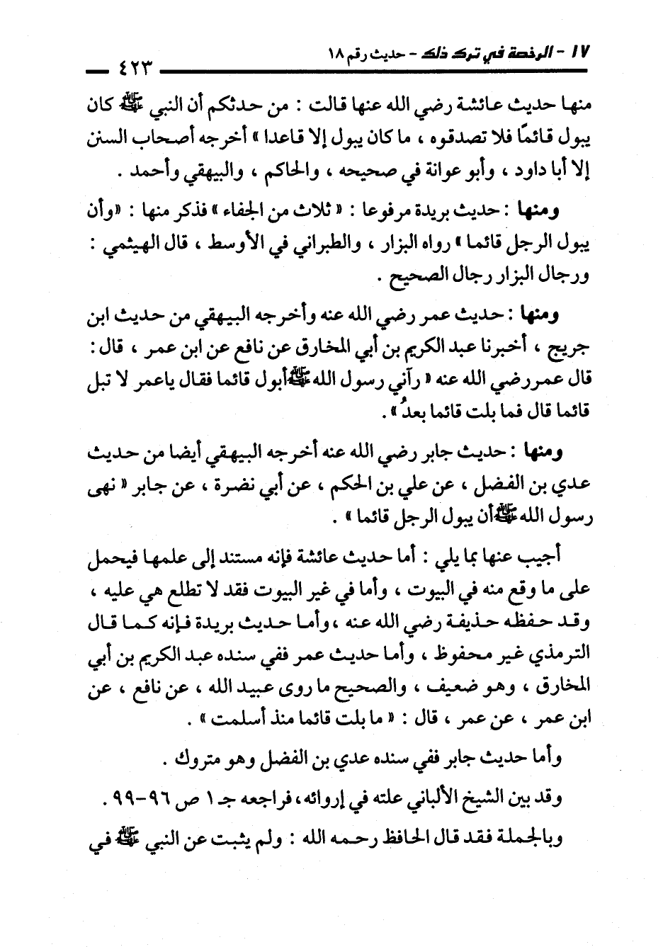 منها حديث عائشة رضي الله عنها قالت: من حدثكم أن النبي - صلى الله عليه وسلم - كان يبول قائمًا فلا تصدقوه، ما كان يبول إلا قاعدا" أخرجه أصحاب السنن إلا أبا داود، وأبو عوانة في صحيحه، والحاكم، والبيهقي وأحمد.