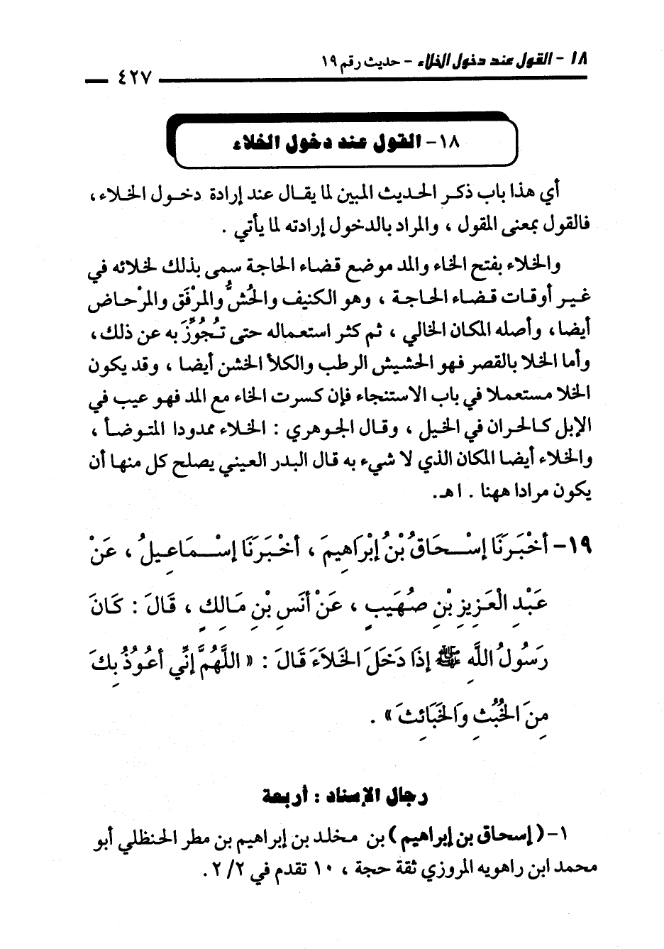 19 - أَخْبَرَنَا إِسْحَاقُ بْنُ إِبْرَاهِيمَ، أَخْبَرَنَا إِسْمَاعِيلُ، عَنْ عَبْدِ الْعَزِيزِ بْنِ صُهَيْبٍ، عَنْ أَنَسِ بْنِ مَالِكٍ، قَالَ: كَانَ رَسُولُ اللهِ - صلى الله عليه وسلم - إِذَا دَخَلَ الْخَلاَءَ قَالَ: "اللَّهُمَّ إِنِّي أَعُوذُ بِكَ مِنَ الْخُبُثِ وَالْخَبَائِثِ".