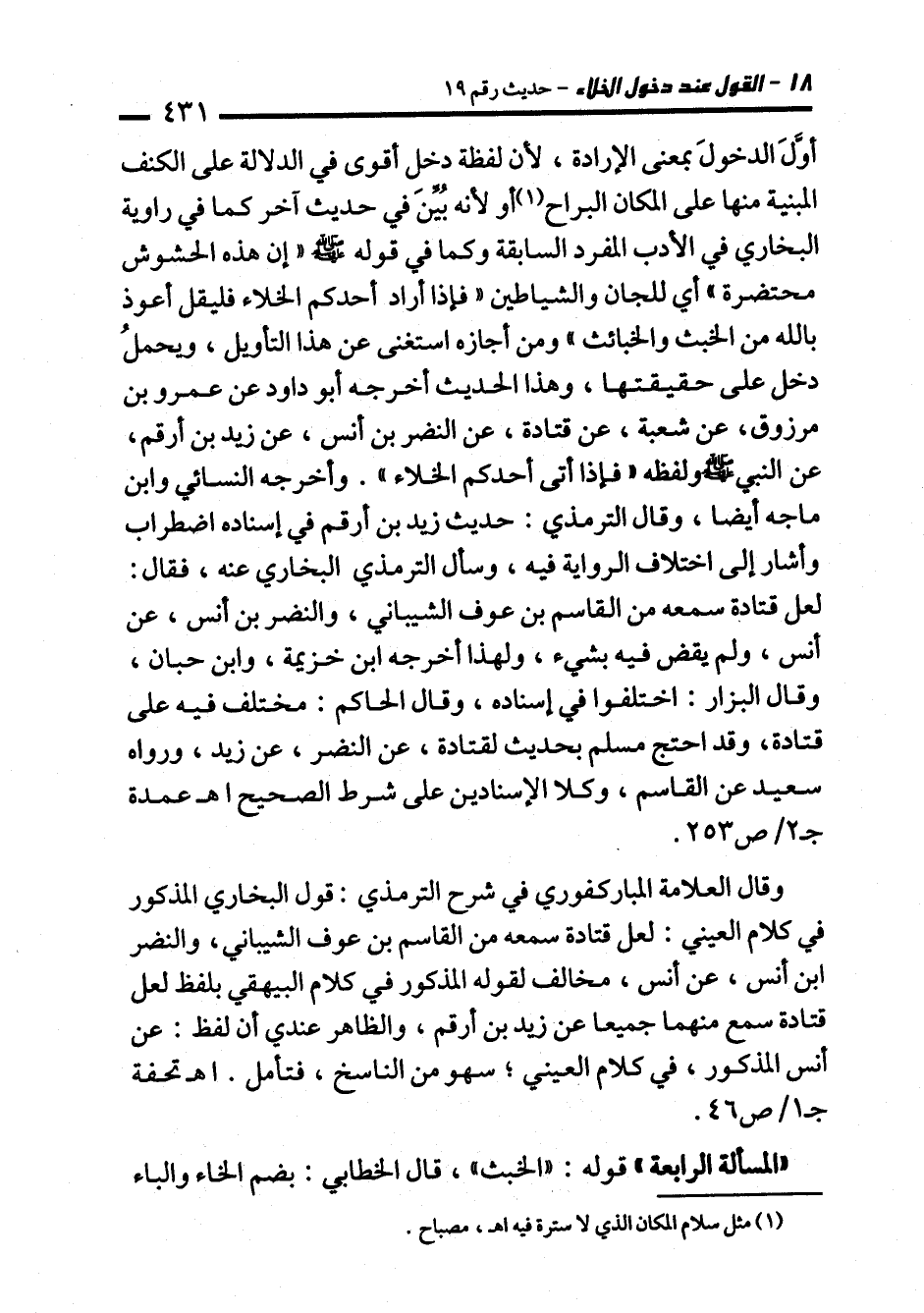 أوَّلَ الدخولَ بمعنى الإرادة، لأن لفظة دخل أقوى في الدلالة على الكنف المبنية منها على المكان البراح (¬1) أو لأنه بُيِّنَ في حديث آخر كما في راوية البخاري في الأدب المفرد السابقة وكما في قوله - صلى الله عليه وسلم - "إن هذه الحشوش محتضرة" أي للجان والشياطين "فإذا أراد أحدكم الخلاء فليقل أعوذ بالله من الخبث والخبائث" ومن أجازه استغنى عن هذا التأويل، ويحملُ دخل على حقيقتها، وهذا الحديث أخرجه أبو داود عن عمرو بن مرزوق، عن شعبة، عن قتادة، عن النضر بن أنس، عن زيد بن أرقم، عن النبي - صلى الله عليه وسلم - ولفظه "فإذا أتى أحدكم الخلاء". وأخرجه النسائي وابن ماجه أيضا، وقال الترمذي: حديث زيد بن أرقم في إسناده اضطراب وأشار إلى اختلاف الرواية فيه، وسأل الترمذي البخاري عنه، فقال: لعل قتادة سمعه من القاسم بن عوف الشيباني، والنضر بن أنس، عن أنس، ولم يقض فيه بشيء، ولهذا أخرجه ابن خزيمة، وابن حبان، وقال البزار: اختلفوا في إسناده، وقال الحاكم: مختلف فيه على قتادة، وقد احتج مسلم بحديث لقتادة، عن النضر، عن زيد، ورواه سعيد عن القاسم، وكلا الإسنادين على شرط الصحيح اهـ عمدة جـ 2/ ص 253.