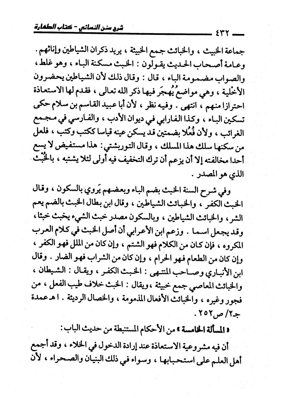 وعامة أصحاب الحديث يقولون: الخبث مسكنة الباء، وهو غلط، والصواب مضمومة الباء، قال: وقال ذلك لأن الشياطين يحضرون الأخْلية، وهي مواضعُ يُهجَر فيها ذكر الله تعالى، فقدم لها الاستعاذة احترازا منهم، انتهى. وفيه نظر؛ لأن أبا عبيد القاسم بن سلام حكى تسكين الباء، وكذا الفارابي في ديوان الأدب، والفارسي في مجمع الغرائب، ولأن فُعُلا بضمتين قد يسكن عينه قياسا ككتب وكتب، فلعل من سكنها سلك هذا المسلك، وقال التوربشتي: هذا مستفيض لا يسع أحدا مخالفته إلا أن يزعم أن ترك التخفيف فيه أولى لئلا يشتبه، بالخُبْث الذي هو المصدر.