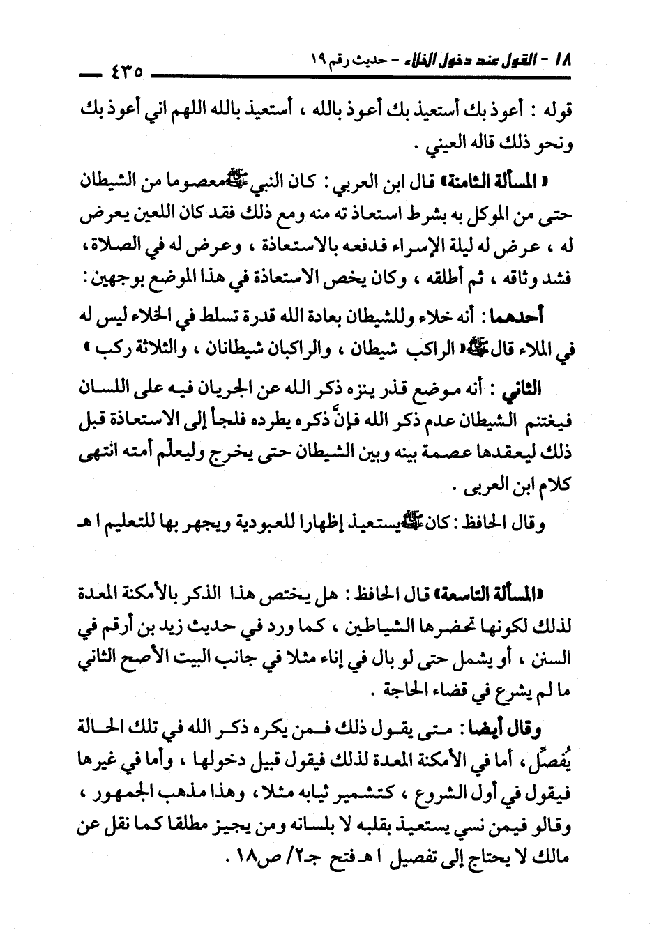 "المسألة التاسعة" قال الحافظ: هل يختص هذا الذكر بالأمكنة المعدة لذلك لكونها تحضرها الشياطين، كما ورد في حديث زيد بن أرقم في السنن، أو يشمل حتى لو بال في إناء مثلا في جانب البيت الأصح الثاني ما لم يشرع في قضاء الحاجة.