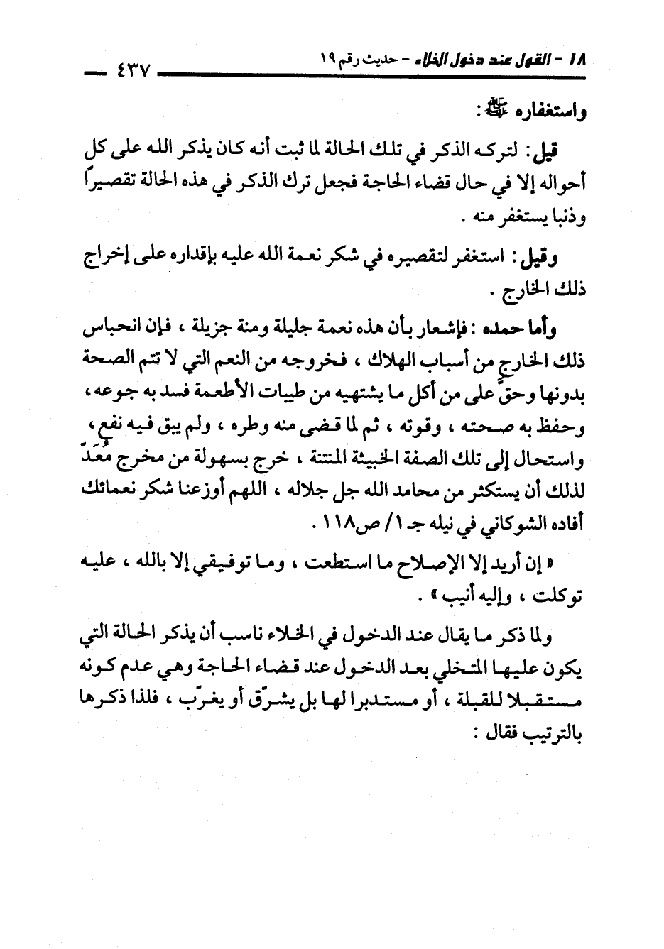 وأما حمده: فإشعار بأن هذه نعمة جليلة ومنة جزيلة، فإن انحباس ذلك الخارج من أسباب الهلاك، فخروجه من النعم التي لا تتم الصحة بدونها وحقَّ على من أكل ما يشتهيه من طيبات الأطعمة فسد به جوعه، وحفظ به صحته، وقوته، ثم لما قضى منه وطره، ولم يبق فيه نفع، واستحال إلى تلك الصفة الخبيثة المنتنة، خرج بسهولة من مخرج مُعَدّ لذلك أن يستكثر من محامد الله جل جلاله، اللهم أوزعنا شكر نعمائك أفاده الشوكاني في نيله جـ 1/ ص 118.